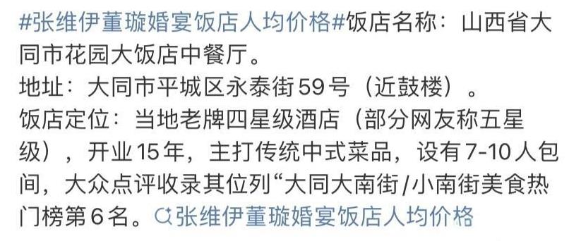 张维伊董璇婚宴饭店人均价格曝光!终于懂佟丽娅当天为啥那副耐人寻味的表情了! 这不能怪佟丽娅表情失控,张维伊非要把婚礼安排在他老家,宴请的基本都是他家的亲友团,董璇在节目里很明显不喜欢办婚礼,如果要摆就喜欢那种浪漫唯美的。但张维伊一直想办,还要照顾他家的奶奶和入土为安的爸爸,董璇是个软心肠的人,却害苦了佟丽娅。 明明董璇是个大明星,佟丽娅也是,却要陪着张维伊在人均67元酒店里笑脸迎人。董璇为了爱她可以放下身段,佟丽娅为了友情也可以,但是明显佟丽娅没被尊重,才有了这样的一个表情。