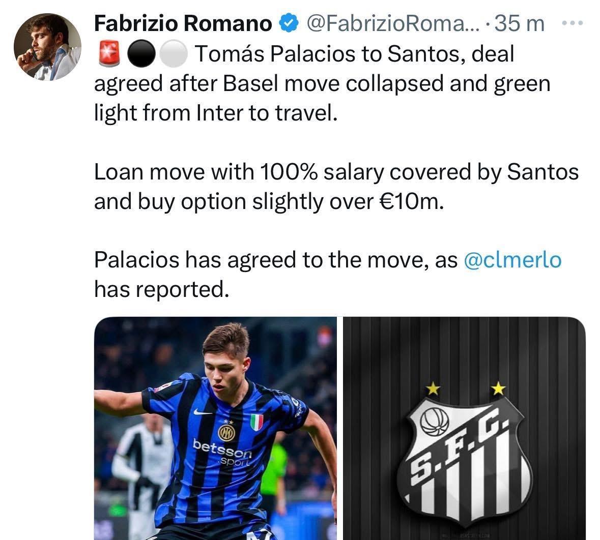 托马斯·帕拉西奥斯 回归南美! 国际米兰这笔交易可以被认为是完成的,阿根廷后卫将离开国际米兰加盟桑托斯。 转会将以租借的形式(小将工资全额由巴西俱乐部承担),购买选择约为1000万欧元。 帕拉西奥斯之前在谈的几个欧洲俱乐部都没有下文,预计今天最晚明天去巴西体检。 据说国际米兰还留下了30%的二次转会分成,这也是看好帕拉西奥斯潜力啊!