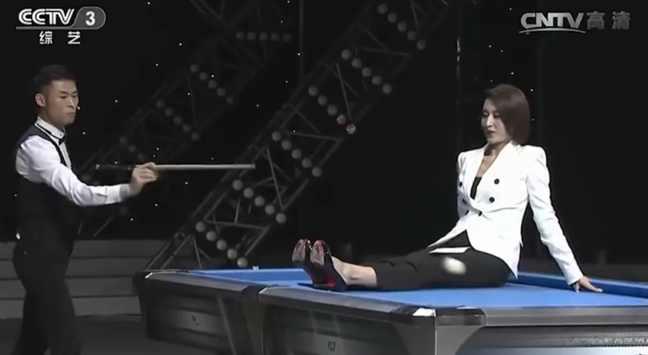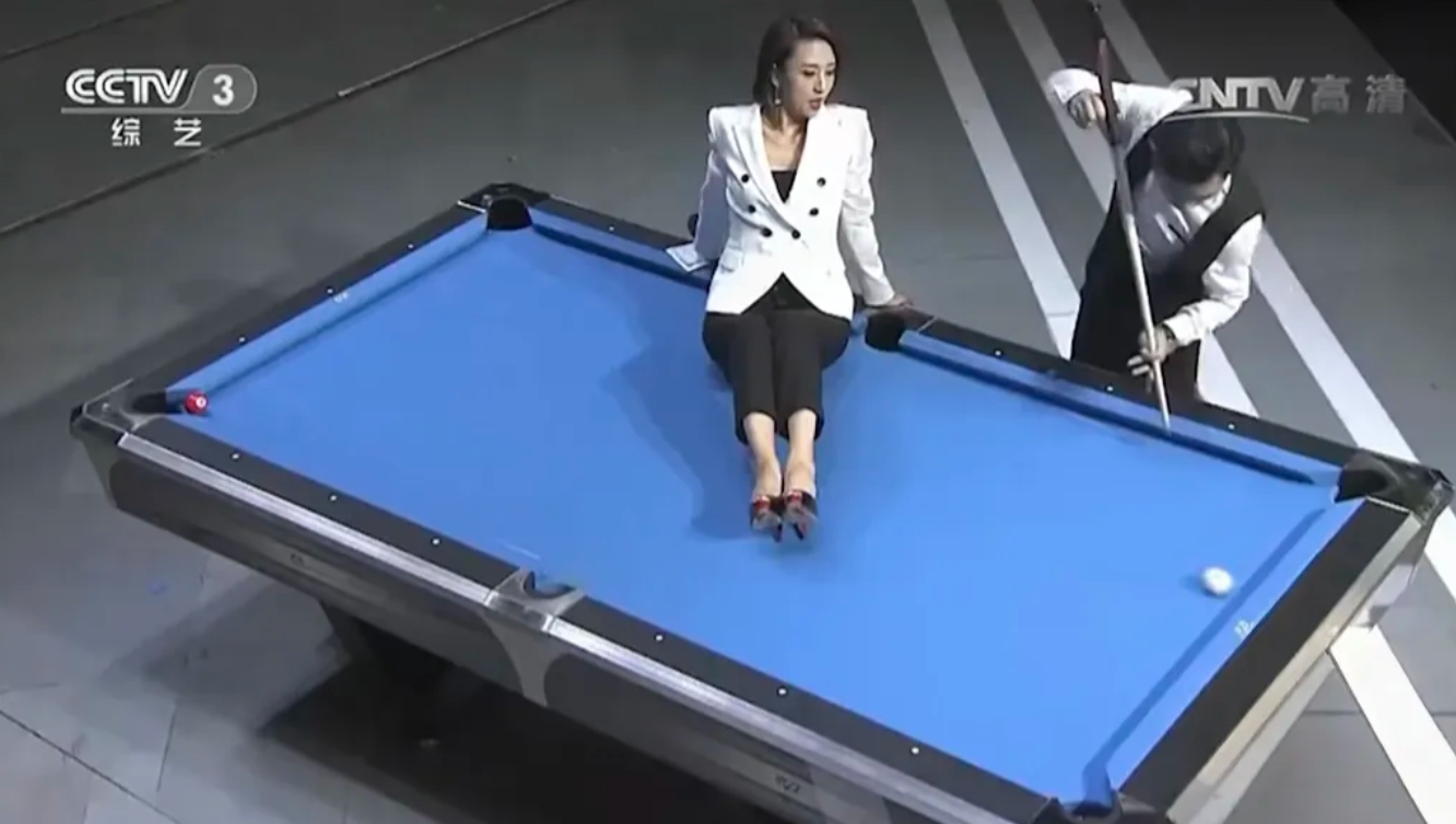 美女主持人张蕾坐在台球案上,配合花式台球高手进行花式击球表演。别的不说,美女穿得高跟鞋实在跟美女的身份不符啊!