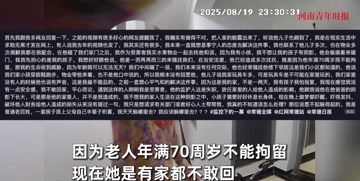 “必须严惩!”8月24日湖南常德,一位女子用尽半辈子的积蓄买了一套房子,可谁知楼下却住着一位70多岁的怪脾气老太,经常半夜来砸门,女子为此找过物业以及报警多次,但都无法解决,因为老人已经年满70周岁所以无法拘留,可女子想搬走也没有钱,只能无奈忍受折磨,网友:非要把人逼到一定地步才知道后悔! (信息来源:浪潮新闻——女子称遭邻居(七旬老人)多次砸门骚扰不敢回家, 老人年满70周岁不能拘留) 在湖南常德的某个小区,一场邻里纠纷正持续上演,打破了小区应有的宁静。 9楼的李女士一家,倾尽自己将近半生的积蓄,终于在心仪的地方买下一套房子。 可本应在新房中安享幸福生活的她,如今却深陷困扰。 这一切的开端,只因楼下一位 70 多岁老太长达一年多的无端骚扰。 冲突源于老太毫无根据的指控。 她坚称李女士家孩子穿胶鞋跑步以及玩玩具车的声音过大,严重影响到她的生活。 但事实上,李女士家与老太家中间还隔着一层楼,且物业多次上门仔细核查,屋内根本不存在胶鞋和玩具车。 更为离谱的是,即便李女士全家外出,老太依旧会准时上门砸门,可见所谓“噪音”只是借口。 据悉,这位老太最初将噪音的怀疑对象指向了8楼住户。 在对方明确否认后,她并未打消疑虑,反而带着“家里有孩子就肯定会吵闹”的固有偏见,将矛头无端转向了9楼的李女士一家。 老太的骚扰手段愈发过分,不分白天黑夜,频繁对着李女士家的房门用力砸击。 那粗暴的动作伴随着沉闷又刺耳的声响,不仅打乱了李女士一家的正常作息,连楼道里的其他住户都能时常听到这令人心慌的动静。 巨大声响常常出现在深夜,静谧的小区中声音是那么的刺耳。 她甚至曾将李女士家的门铃直接砸坏。 长期处于这样的环境下,李女士年幼的孩子受到严重惊吓,心理阴影挥之不去,如今只要一听到敲门声,便会浑身发抖。 李女士自己也整日提心吊胆,回家这件原本再平常不过的事,如今却让她充满恐惧,甚至产生不敢轻易回家的念头。 面对这一困境,李女士一家尝试了所有能想到的办法。 她多次向物业反映,期望物业能从中调解,恢复生活安宁。 可物业的介入不仅没有效果,反而让老太的行为变本加厉。 李女士也曾带着善意,提着水果上门与老太和谈,试图化解矛盾,却依旧无法打动老太。 她还联系到了老太远在外地的儿子,希望家属能约束老人行为,得到的却只有一句冷漠的“管不了”,此后再无音信。 无奈之下,李女士选择报警,这也是她最后的希望。 然而,警方多次出警后,因老太年满70周岁,依据《治安管理处罚法》规定,无法对其执行行政拘留。 警方的调解与警告对老太而言毫无威慑力,每次调解后,砸门行为不仅没有收敛,夜里砸门次数反而更加频繁。 即便警方依法提出罚款惩戒,老太始终拒不配合缴纳,其家属也始终采取放任态度,这一处罚措施最终陷入难以执行的僵局。 眼见所有常规途径均告无效,走投无路的李女士,只能将家中监控记录下的老太砸门画面发布至网络,试图寻求更多帮助。 视频里,老太抡起拳头或工具狠砸房门的动作极具冲击力,沉闷又响亮的撞击声透过屏幕都能让人感受到压迫感。 这段内容一经发布,很快就吸引了大量网友关注,迅速在网络上引发广泛讨论。 网友们纷纷为李女士出谋划策,有的建议安装报警器,有的提议持续监控取证,还有人主张起诉精神损害赔偿。 但也有部分网友提出不切实际甚至非法的建议,这背后反映出公众对官方渠道解决此类问题能力的质疑。 许多网友担忧,李女士一家在长期压抑下,情绪可能崩溃,做出冲动行为,导致更严重悲剧。 这起事件,不仅是李女士一家的遭遇,也暴露了现有社会治理体系在处理特殊人群不法行为时的漏洞。 类似的事情在当下越来越常见,特殊人群仗着自己特殊知法犯法,严重侵害了他人的权益。 让我们亟待引起官方重视并解决问题。