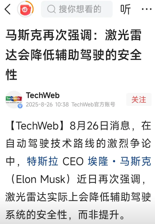 马斯克之所以不用激光雷达方案一是贵,二是性能远比不上华为的。 贵是因为博世激光雷达套餐售价2万多美元。 由于美国政府的制裁,特斯拉不能用我国激光雷达,只能用博世又贵又落后的。 而华为自研的192线激光雷达售价才2千多美元。 还有就是激光雷达毫米波雷达和摄像头算法的融合它搞不定! 马斯克自从和特朗普闹掰之后,各地掀起了抵制特斯拉,和特斯拉股票的市值也大跌。 希望在中国市场能够赚取更多的利润。 但目前中国市场的内卷非常严重。 特斯拉换代没有那么快,压力也非常大。