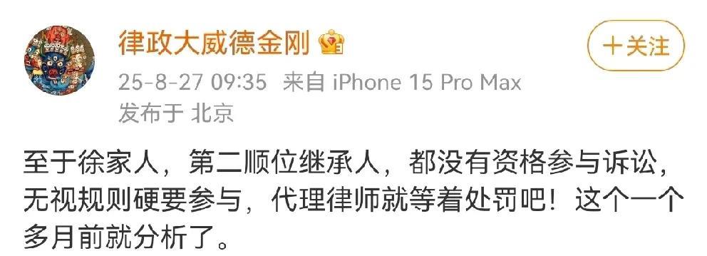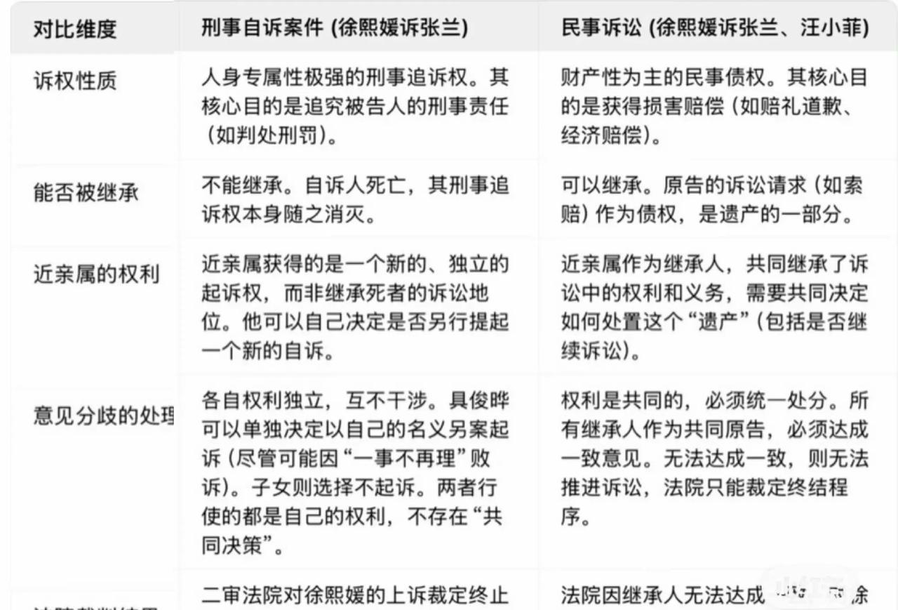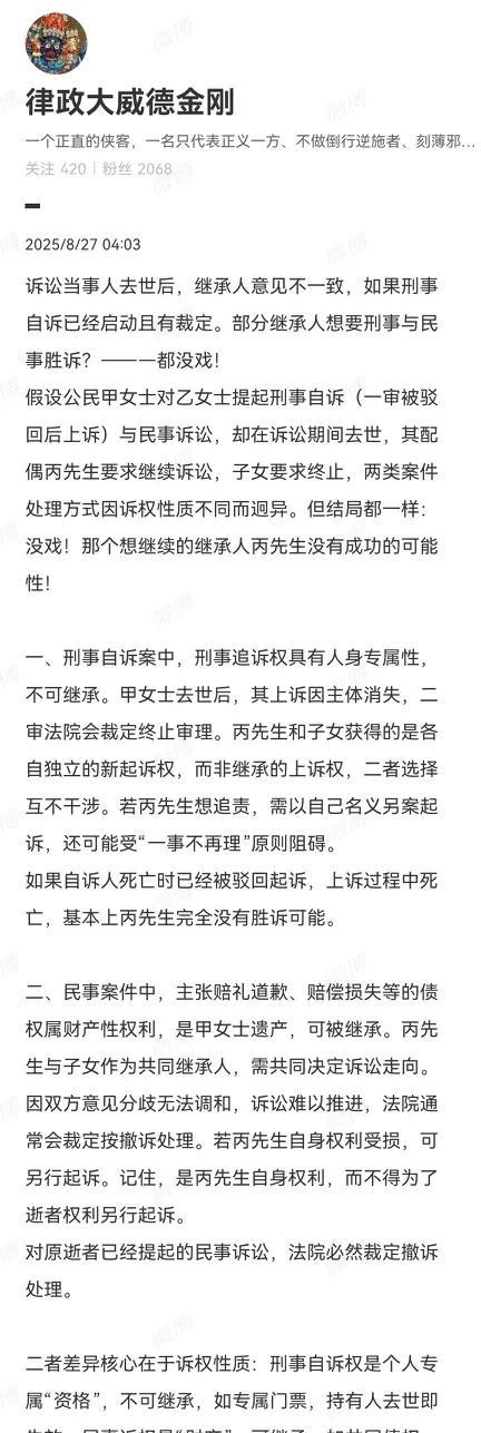 邓律师会被处罚?今天凌晨,平商律所和苏春莉律师都发布了专业的普法文章或视频。截至现在,邓律师还没有对此进行法律层面的专业回应。仅表示下个月要提告某人以及辟谣律师费数额。 根据普法,刑事自诉案追诉权无法继承。具俊晔可以自己另案开一个诉讼,但胜诉概率极低。 民事案件中的财产性权利可以继承,但需要具俊晔和子女共同决定。如果双方意见不一致,法院一般按撤诉处理。 如果邓律师无法证明已经获得了汪小菲代子女的授权,那么授权手续合法性存在瑕疵,相关代理行为涉嫌违反相关法律及规范,待监管部门核查纠正。 苏律师也表示,徐家人无视规则硬要参与,“代理律师就等着处罚吧”。