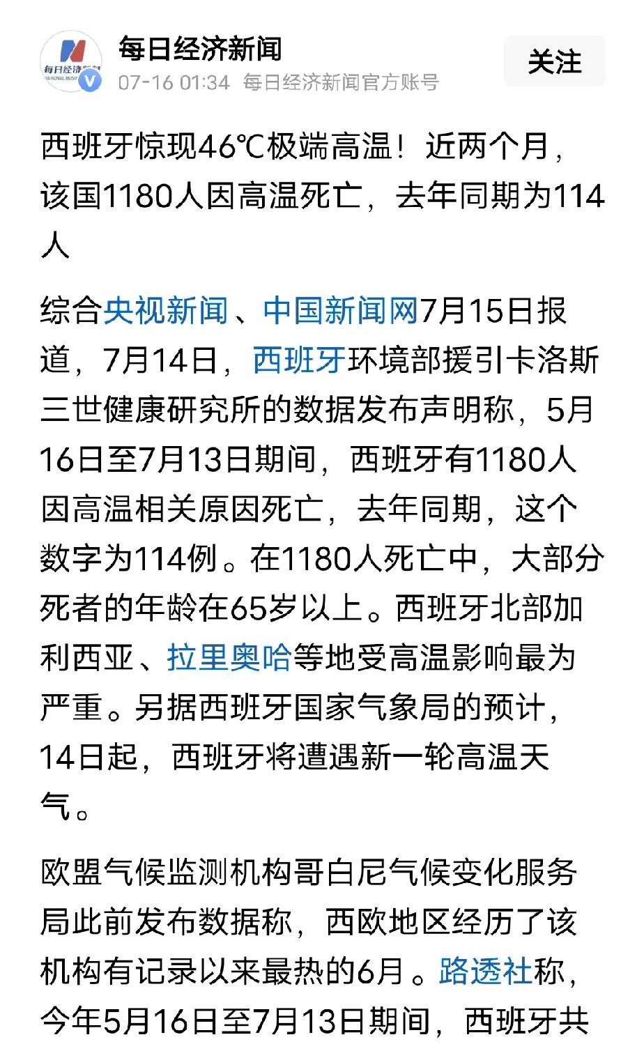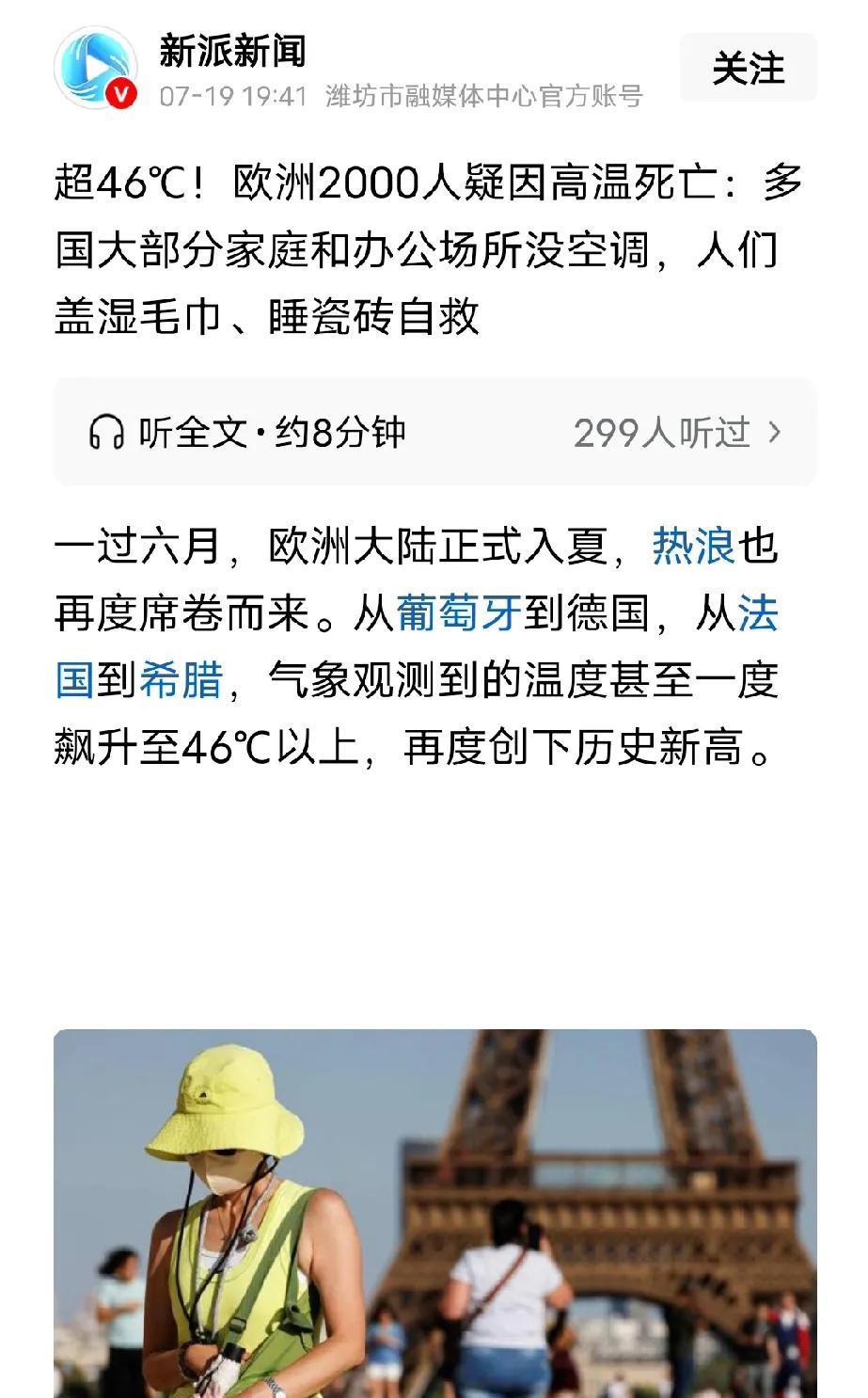 日本中暑5.9万人,热死75人, 欧洲热死2000多人, 西班牙热死1180人, 发达国家,空调不贵,安装空调贵,电费贵,欧洲电力短缺,天热不舍得开空调,有的甚至没有电。 七月份我国用电突破1万亿度,很多家庭都是空调随便用。