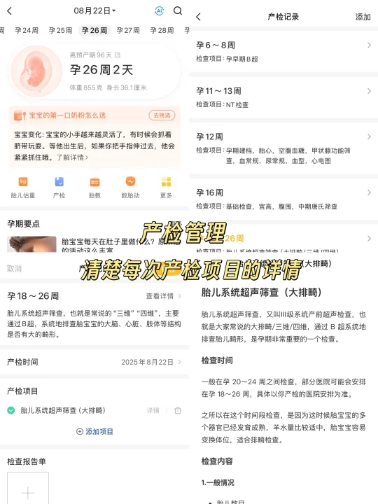 内置自动提醒,产检前还会推送注意事项,检查项目解读,我每次做完产检立刻上传报告,生成自己的专属健康档案。APP内还可以在孕晚期数胎动,记宫缩,连去医院时医生都夸我记录的好呢
