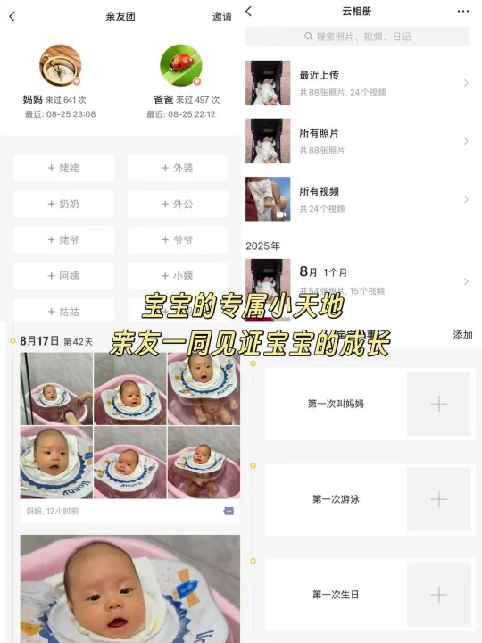 AI自动识别宝宝照片,智能上传,自动按拍摄时间生成专属照片时间轴。记录宝宝的所有大事和成长信息。还可以邀请家人成为亲友团共同见证宝宝成长,不管在哪里都可以第一时间在我发的动态下面互动,超有爱~