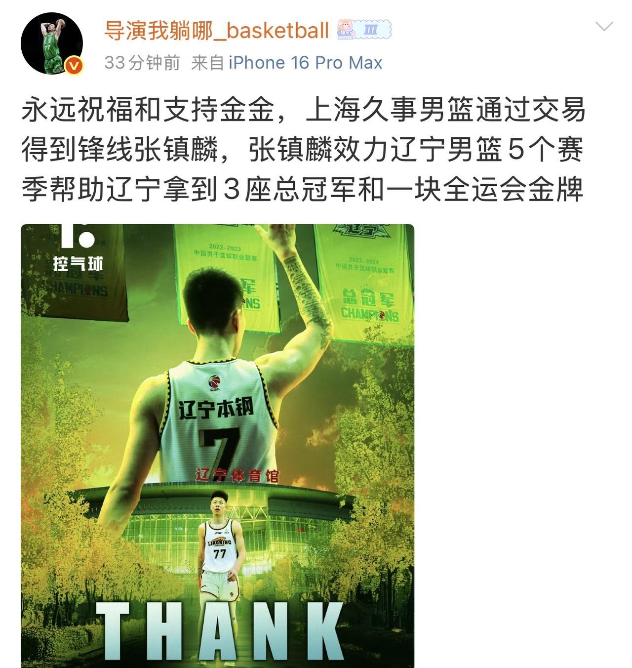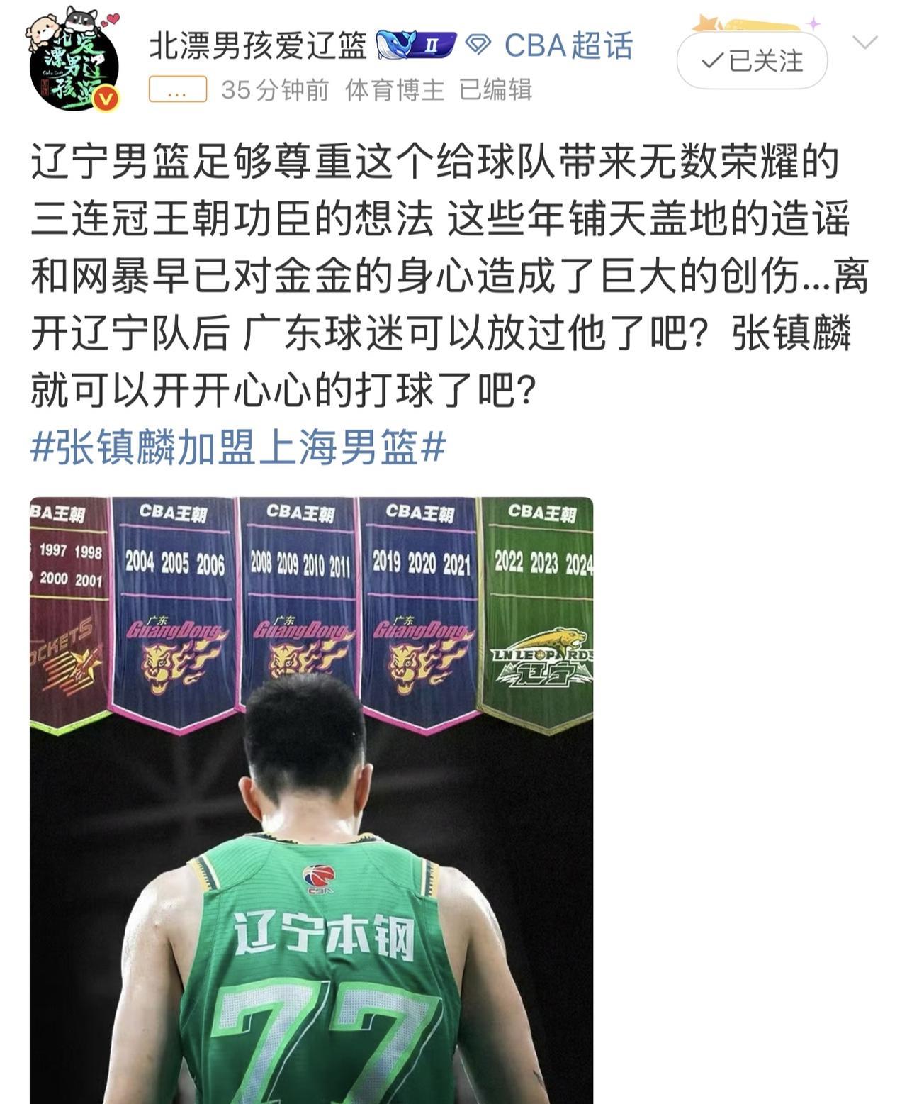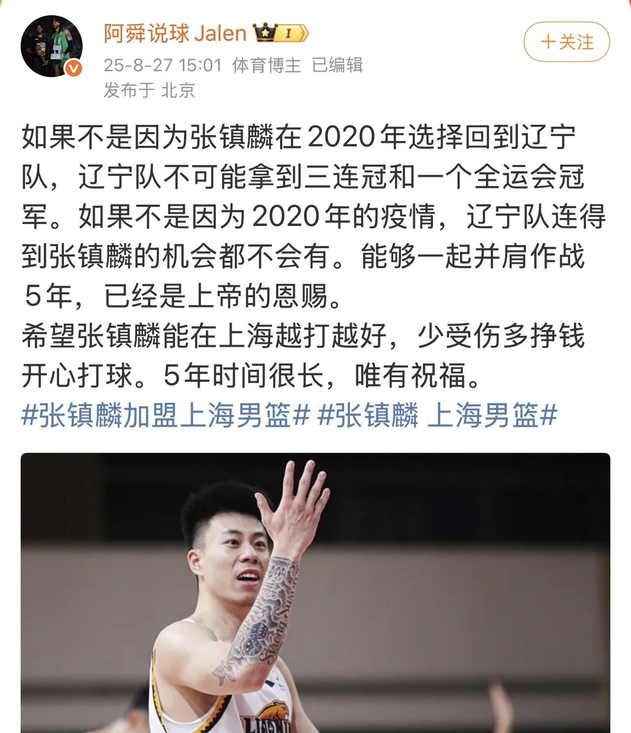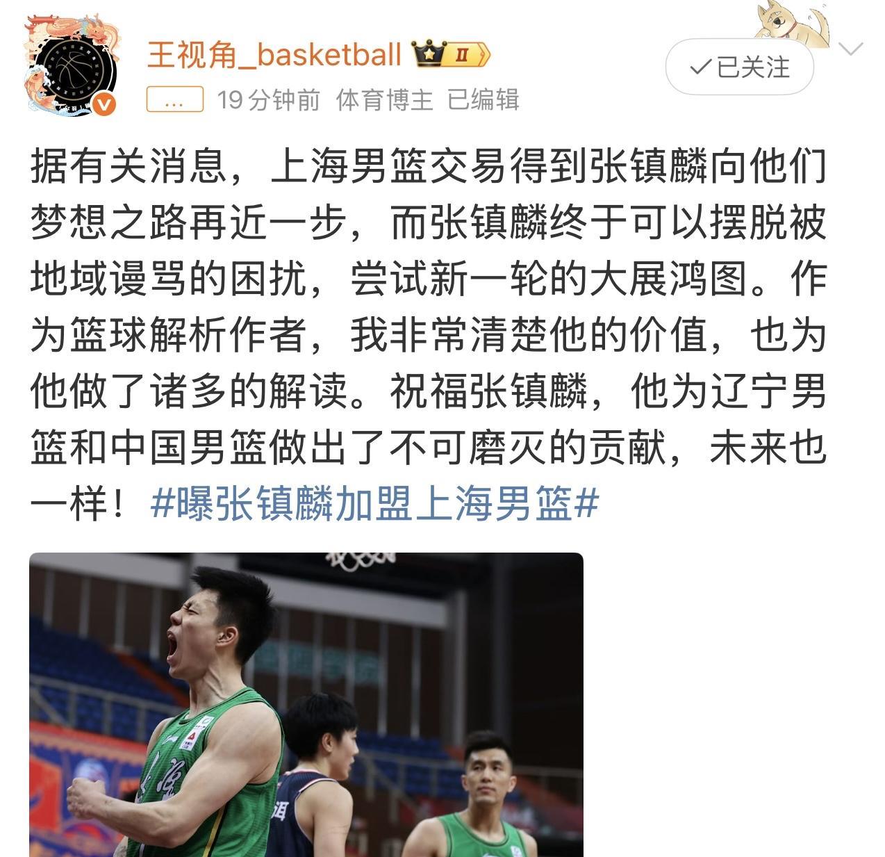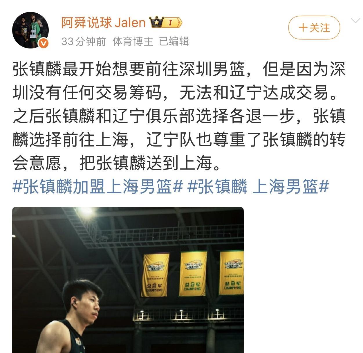 前辽篮队员贺天举表示,像张镇麟转会上海这样的地震级交易,如果完成,那肯定是球员本