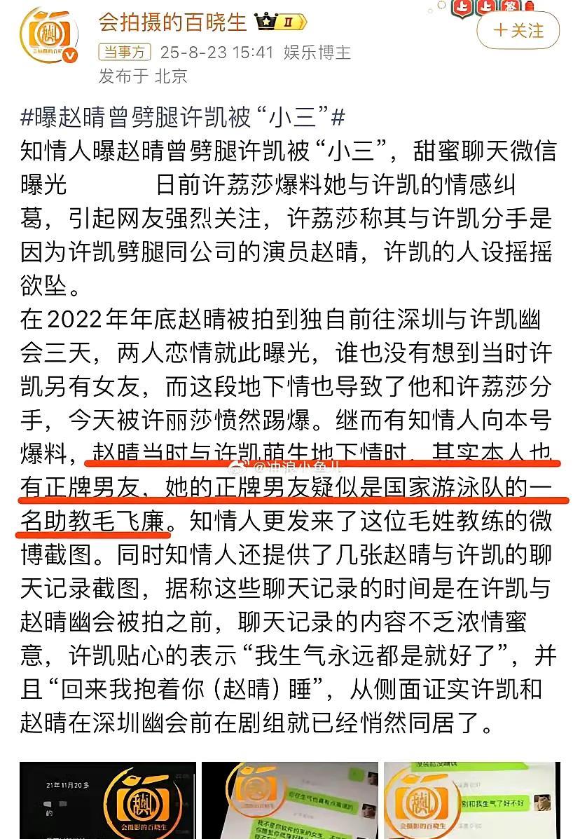 太炸裂了,赵晴和许凯开房的时候原来已经有男友了。知情人士爆料称赵晴和许凯进行地下恋情的时候,赵晴正和国家游泳队的助教毛飞廉交往中。从爆出的聊天记录来看,对话框左边是许凯,右边是赵晴,我猜测是毛飞廉翻到赵晴手机里跟许凯聊天的内容,发现赵晴和许凯有不正当的关系,于是对着赵晴手机拍照,现在把照片爆料给了媒体。