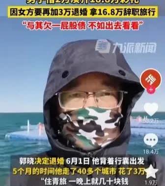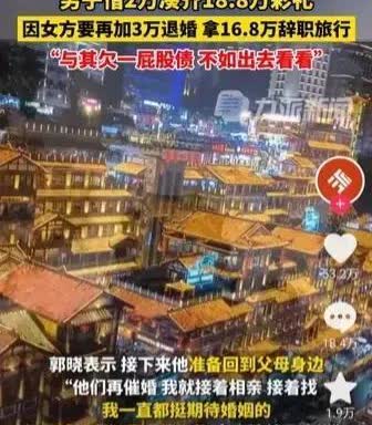山西太原,一男子通过相亲认识一女子,双方谈好了18.8万彩礼,准备结婚。男子积蓄有16.8万,然后问发小借了2万,凑够了彩礼钱。父母打算出首付三四十万在太原买个房子。但是女友听其闺蜜劝告,要求再加3万的彩礼。男子只好与女友分手。男子分手后,为了散心,5个月的时间走了40多个城市,仅仅只花了3万多元。男子说,与其娶老婆欠一屁股债,还不如出去走走。 郭晓,35岁,山西太原人,在服务行业工作,平时生活挺节省,攒了十多万元。爸妈老催他结婚,他就去相亲了,结果和林女士看对眼了,两人谈了九个月恋爱。说到结婚,女方家要18.8万元彩礼。郭晓把老底都掏出来了,还跟从小一起玩到大的朋友借了2万元,这才凑够数。他爸妈也拿出三四十万,想在太原给他买套房。 可就在准备婚礼的时候,林女士突然说要再加3万元彩礼,说是闺蜜给出的主意。郭晓一听就懵了,觉得这实在是太多了,家里已经拿出所有积蓄了。他想了想,还是决定分手,林女士也没多说什么就同意了。分手后,郭晓没跟爸妈说这事儿,也不听他们劝,坚决不跟林女士和好。他把工作辞了,把借的钱还了,背上包就出门旅游去了。 五个月里,他走了40多个城市,住便宜的旅馆,坐火车硬座,总共才花了三万多元。郭晓觉得,与其为了结婚背上债,还不如出去看看世界呢。 旅行回来,郭晓心情平静多了。他说自己还是想结婚,但不想再因为结婚而欠债。这段感情结束后,他看清了很多事情,也找到了另一种活法。