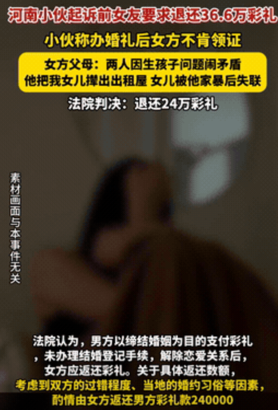 “白嫖成功了?”河南上蔡,一男子和女子举办婚礼后同居,结果生活了才几个月,就因为贾某不愿领结婚证而分手!黄某觉得气不过,就要求贾某退回36.6万元彩礼和五金,没成想却遭到贾某拒绝!一气之下,男子将对方告上法庭,而判决结果却让人意外!网友:谁还敢结婚? 上蔡的黄某和贾某是通过别人撮合认识的,因为黄某一开始就是奔着结婚,所以相处没多久,就托媒人给了贾某10万块彩礼。 过了一阵,他又给贾某补了22万,就怕诚意不够,按当地的规矩,黄某还特意准备了4万6的上车礼,光这三笔钱加起来就有36万6,另外还有一套五金首饰,这些都是黄某实打实掏的钱。 今年1月,俩人按当地习俗办了热闹的婚礼,之后就跟夫妻似的住在了一起,可谁能想到,才一起过了四个多月,到5月份的时候,俩人就闹得不可开交,最后干脆分手了。 更关键的是,从头到尾,他们都没去民政局领过结婚证,黄某越想越觉得不值,钱花出去不少,婚没结成,于是就找贾某要回那36万6的彩礼和五金,可贾某怎么都不肯退,两边谁也说服不了谁。 没办法,黄某只能走法律途径,把贾某告到了当地法院,开庭的时候,两边说的情况完全不一样,黄某说自己当初给彩礼,就是为了跟贾某结婚,现在贾某不领证还闹分手,这些钱肯定得退回来。 可贾某父母却不这么说,他们说俩口子闹矛盾,是因为生孩子的事没谈拢,而且黄某还把自己女儿从出租屋里赶了出去,甚至动手打过女儿,后来女儿就联系不上了,言外之意是黄某也有责任。 法院把事情查清楚后,很快就下了判决,法院认为,黄某当初给彩礼,核心目的就是为了和贾某结婚,现在俩人没办结婚登记,从法律上不算夫妻,所以贾某确实得返还彩礼。 但考虑到俩人已经一起住过一段时间,双方都有过错,再结合当地结婚的习俗,最后判贾某退给黄某24万彩礼,另外,黄某后来也说不想要五金了,法院也认可了这一点,至于黄某其他的要求,法院没支持。 其实对普通家庭来说,几十万彩礼不是小数目,谁家拿出来都不容易,都是为了能好好过日子,没领证就先办婚礼同居,本身就有风险,一旦分手,彩礼怎么退、谁对谁错,很容易说不清楚,要是当初俩人事先把领证的事办好,或者闹矛盾时能好好商量,也不至于闹到打官司的地步。 大家碰到这种没领证只办了婚礼的情况,觉得分手后彩礼该全退还是按情况退呢?
