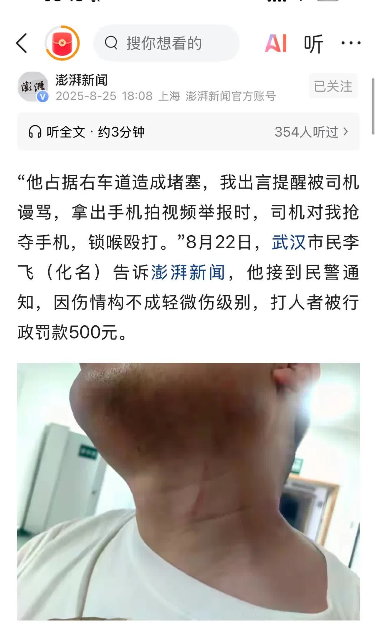 武汉,男子外出,见一辆岚图商务违停,后面车辆只能避让、绕行,甚至有人按喇叭。车里的司机却跟没事人似的,和副驾上的一名女子有说有笑的聊天。男子看不下眼去了,上前提醒却被拒,随后,他拿出手机拍摄司机车牌,占道位置,准备向相关部门举报。 所以大家知道怎么做了吧?能玩狠的就随心所欲;反之,遇事绕道走,尤其不要管闲事。 打人是不对的,只罚500,那轻松,下次他还会打,用钱能搞定,想打就打。 武汉很正常的,我有一次去武汉出差,一条双向两车道,别人就把车停马路上,按喇叭也不走起了冲突,他直接逆行把我逼停然后撒泼,我报警近一个小时帽子才来,来了可能看我是外地人,就登记我一个人的身份信息,了解事情经过后让我给对方道歉,说马路是公共场所,任何人有权利随时随地停车,我不能对他怎样,我开始坚决不道歉,然后帽子说那就扣车带我去派出所接着沟通,不解决不准走,特么的搞了两个小时天都黑了,我是外地的有点害怕,最后只有道歉走人,从此以后去武汉开车碰到路上的违章车都只有忍。