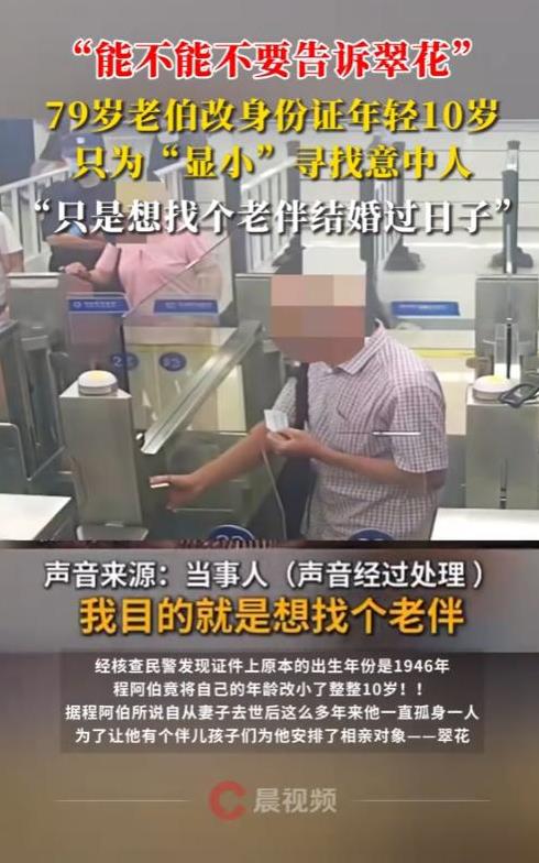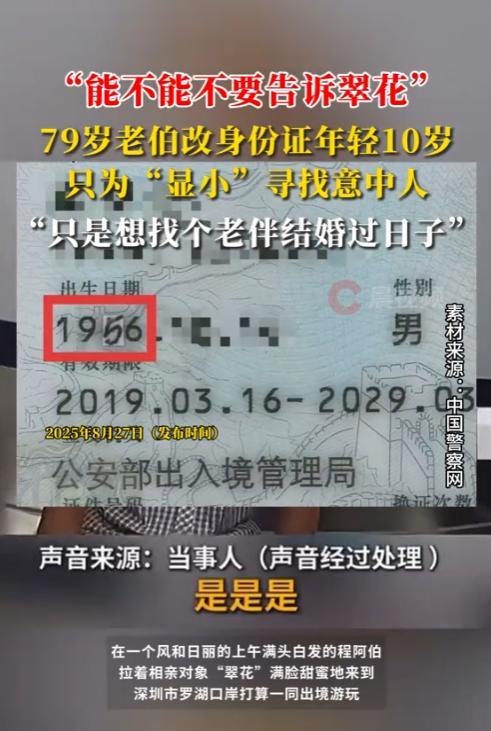 “离了个大谱!”2025年,深圳,一位79岁的大爷,相亲认识了一名60多岁的女子,万万没想到,才四五天功夫,老爷子竟然一头扎进了热恋!然而,女子却想要和自己同龄的人,为了让自己显小,大爷用贴纸改身份证,年轻10岁! 大爷老伴走了好些年,这些年一直一个人过,孩子们看着老人孤单,心里也不是滋味,就想着帮老爷子找个伴儿,于是托人给大爷安排了相亲,没成想,相亲对象一见面,大爷就动了心。 对方是个60多岁的女士,俩人聊得挺投缘,才四五天的功夫,大爷就跟掉进热恋里似的,满心都是想和这位女士好好过日子,可没高兴几天,大爷就被一盆冷水浇了下来。 那位女士无意间跟他说,自己就想找个年纪差不多、也是60多岁的老伴儿,一起安安稳稳过余生,这话一出口,大爷心里咯噔一下,自己都79岁了,比人家想找的年纪大了十好几岁,这可咋整? 满脑子都是想留住这段感情的大爷,竟想出了个“笨办法”,他翻出自己的身份证,看着上面1946年的出生年份,琢磨着要是能把年份改小点儿,不就能凑到60多岁的年纪了嘛。 于是,他找了张小小的贴纸,在上面写了个“5”,然后小心翼翼地用单面胶把贴纸贴在了身份证出生年份的“4”上面,这么一改,1946年就变成了1956年,大爷的年龄一下就年轻了整整10岁。 之后某天上午,天气特别好,大爷拉着相亲对象的手,打算一起出境玩一玩,可没成想,过关检查的时候,工作人员一眼就看出身份证不对劲,年龄数字看着像是被改过的。 经过仔细核查,改年龄的事儿很快就露了馅,面对工作人员,大爷也知道自己错了,后悔得不行,可他还不忘跟民警叮嘱,千万别把这事儿告诉那位相亲对象,生怕对方知道了就不愿意跟自己处了。 这事儿传开后,不少人都觉得好笑,老人家想找个伴儿的心情能理解,可这么改身份证的做法,确实是犯了糊涂。 信息来源:《“能不能不要告诉翠花”,79岁老伯改身份证年轻10岁,只为显小”寻找意中人》潇湘晨报