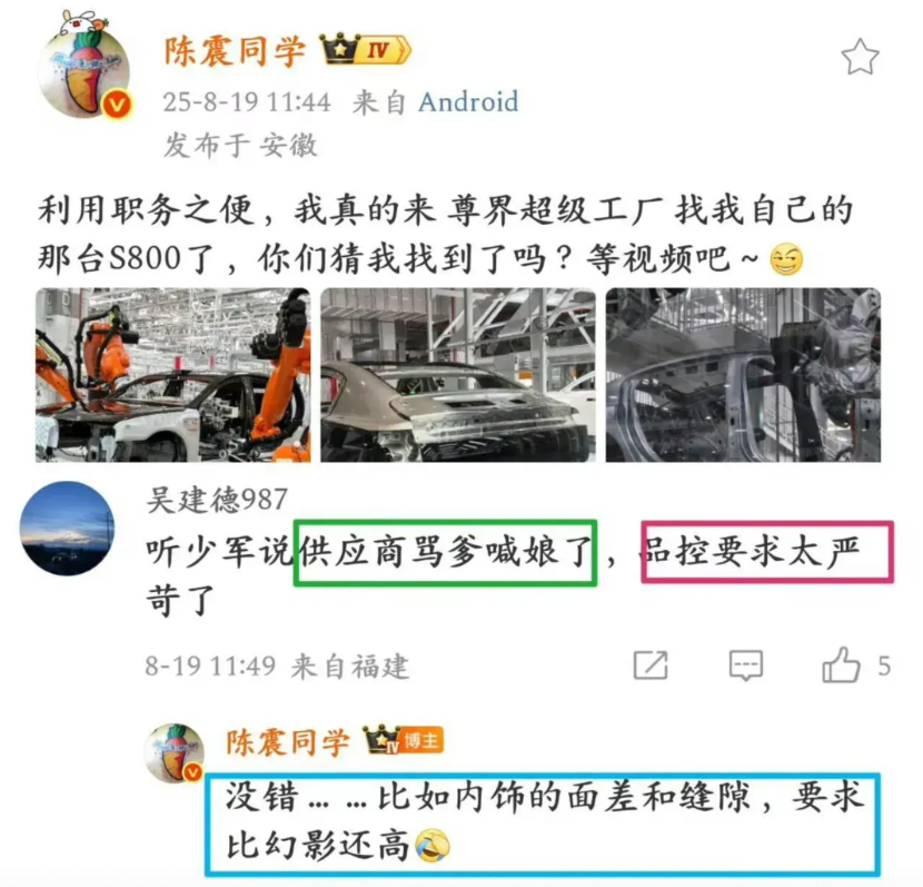 华为真的是太变态了,尊界的存亡在于产量能不能上去! 江淮现在被订单砸晕了,以为尊界原来每年只有3000台,现在订单一家伙就上万台,现在发愁不是汽车能不能卖出去,而是能不能交出去,交不出车,会让等待中的购车者丧失信心。 所以江淮又快乐又很痛苦,痛苦和快乐都是华为给带来的。 8月份第1周200台。 8月份份第2周210台。 8月份第3周166台。 产量上不去是因为零部件需要严格质检,华为对汽车质量的管控严格到变态程度。 江淮的供应商有些也是做出口的,甚至有些也是给顶级豪车配套的,他们说华为对汽车质量的控制严格程度前所未有。供给尊界的汽车零部件退货率平均达到70%以上,总装好以后的质检环节又要刷掉40%,出厂运输到门店都还有被刷掉的。 基本上是一星期产量400台,能交到用户手中的是200台。 所以江淮最近也是疯狂招一些有汽车质量管理控制经验的中高层,希望能尽快稳定提高质量。 华为也是拼了,在中国打造百万级豪车还是第1次,为了成功,绝对不能轻轻松松。 就看华为能不能带飞江淮。