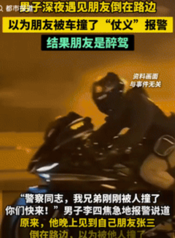 男子晚上散步,看到朋友倒在路边,旁边还倒着一辆摩托车,以为朋友遭遇车祸,赶紧报了警。