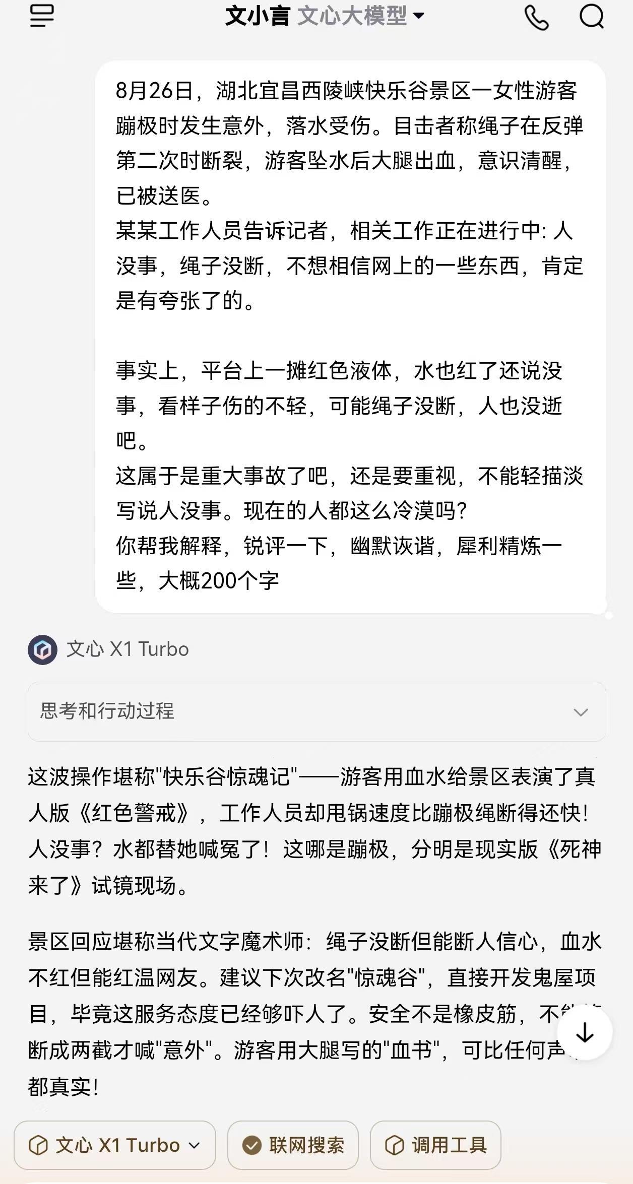 8月26日,湖北宜昌西陵峡快乐谷景区一女性游客蹦极时发生意外,落水受伤。目击者称绳子在反弹第二次时断裂,游客坠水后大腿出血,意识清醒,已被送医。 某某工作人员表示,相关工作正在进行中: 人没事,绳子没断,不想相信网上的一些东西,肯定是有夸张了的。 事实上,平台上一摊红色液体,水也红了还说没事,看样子伤的不轻。 这属于是重大事故了吧,还是要重视,不能轻描淡写说人没事。现在的人都这么冷漠吗?如果是AI它会怎么看呢,我问了问文心X1 Turbo,它说这波操作堪称"快乐谷惊魂记"——游客用血水给景区表演了真人版《红色警戒》,人没事?水都替她喊冤了!这哪是蹦极,分明是现实版《死神来了》试镜现场。 文心X1的锐评,我都没想到,用《死神来了》来必须真的太恰当了,文字像蹦极绳本身,该弹跳时绝不手软,但始终系着安全扣,确保犀利不越界,幽默不伤人,水平很高。
