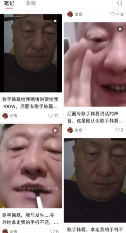 其中一个视频里,韩磊拿刀顶着自己的额头,也不知道这动作是啥意思。还有个长达1分钟的视频,韩磊嘴里叼着烟,神情特别认真,他把嘴凑近屏幕说话,可“治愈”给视频加了背景音乐,根本听不清韩磊说了啥。