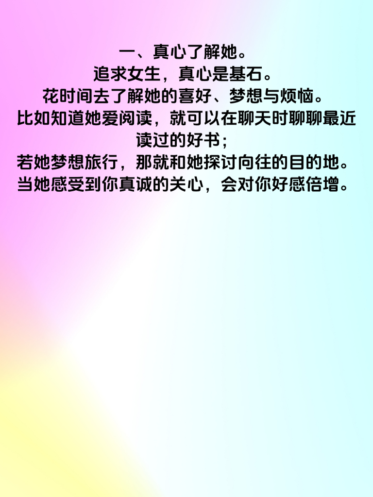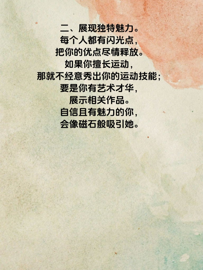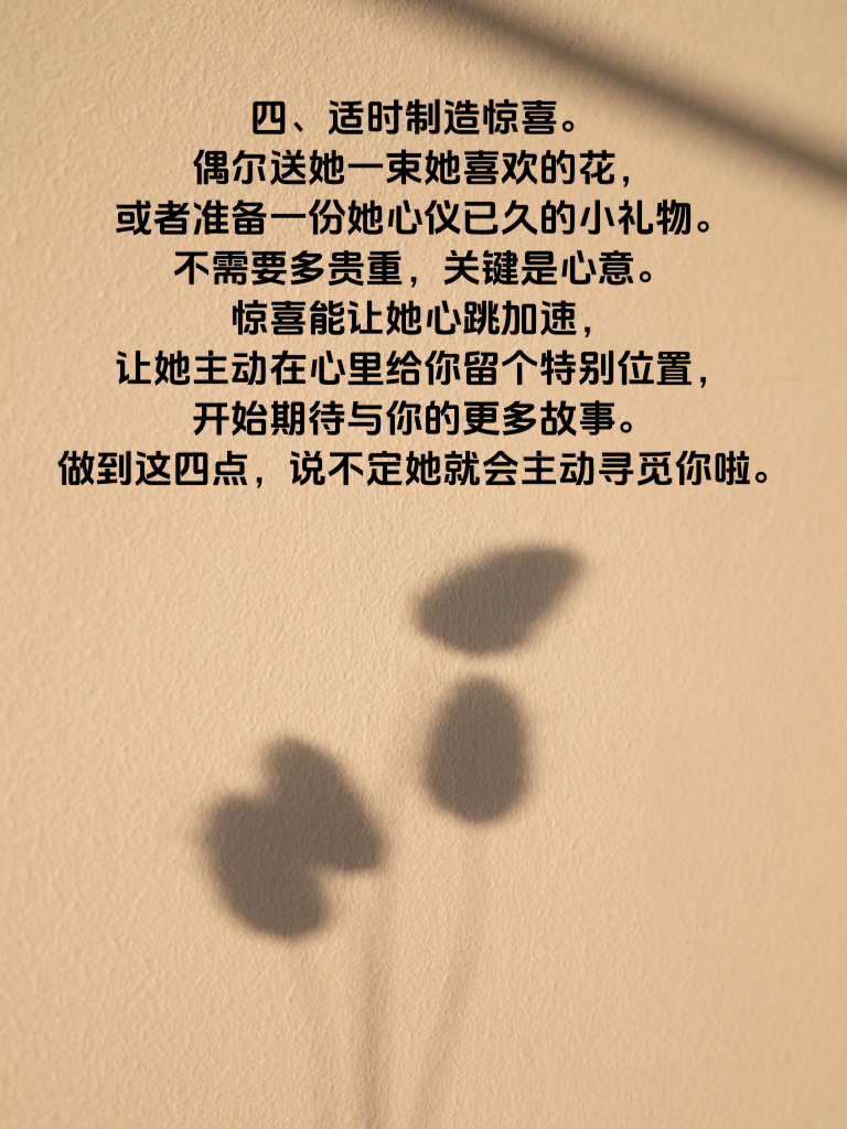 一、真心了解她。追求女生,真心是基石。花时间去了解她的喜好、梦想与烦恼。比如知道她爱阅读,就可以在聊天时聊聊最近读过的好书;若她梦想旅行,那就和她探讨向往的目的地。当她感受到你真诚的关心,会对你好感倍增。 二、展现独特魅力。每个人都有闪光点,把你的优点尽情释放。如果你擅长运动,那就不经意秀出你的运动技能;要是你有艺术才华,展示相关作品。自信且有魅力的你,会像磁石般吸引她。 三、保持适当距离。别追得太紧,给彼此空间。她有自己的生活,你也有你的精彩。偶尔各自忙自己的事,之后再分享有趣经历,会让她觉得你独立又有趣,更增添对你的好奇。 四、适时制造惊喜。偶尔送她一束她喜欢的花,或者准备一份她心仪已久的小礼物。不需要多贵重,关键是心意。惊喜能让她心跳加速,让她主动在心里给你留个特别位置,开始期待与你的更多故事。做到这四点,说不定她就会主动寻觅你啦。