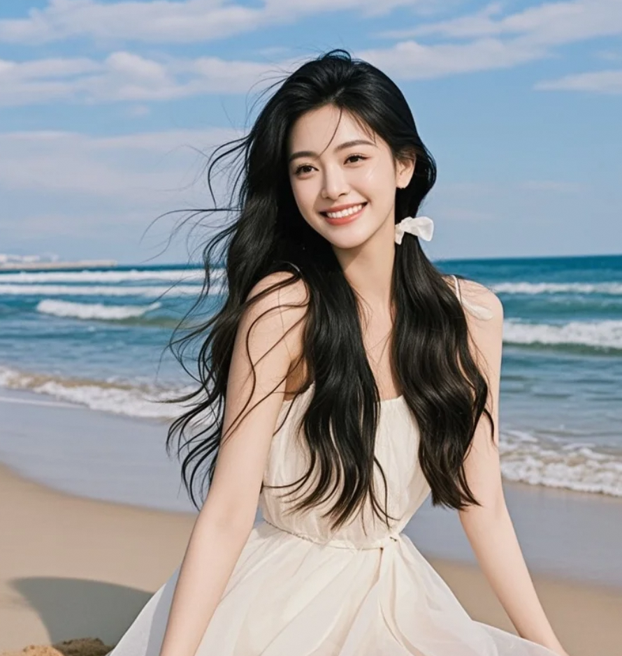 宁静的海滩,长发少女的温柔笑容如诗般动人