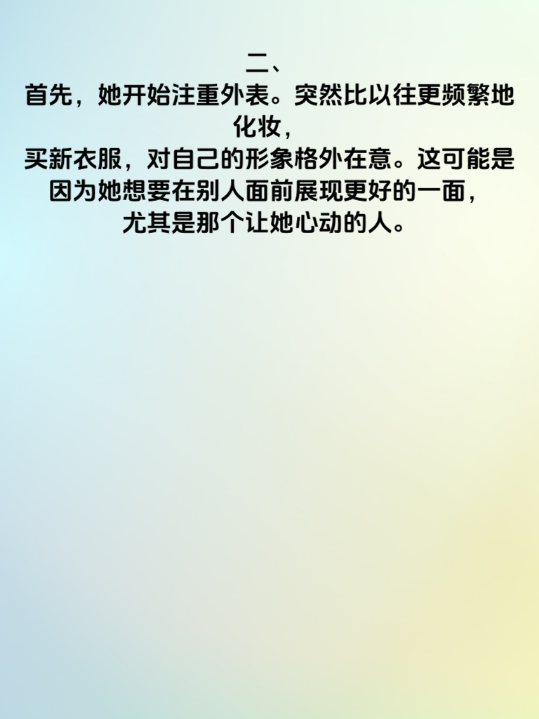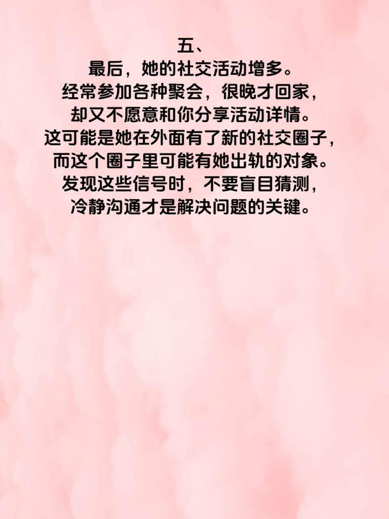 一、女人出轨,往往会出现一些微妙的信号。这些信号可能不易察觉,但却能反映出她们内心的变化。 二、首先,她开始注重外表。突然比以往更频繁地化妆、买新衣服,对自己的形象格外在意。这可能是因为她想要在别人面前展现更好的一面,尤其是那个让她心动的人。 三、其次,她的手机使用习惯改变。总是背着你接电话,聊天记录也变得小心翼翼,甚至经常删除信息。这说明她可能在和某个秘密的人保持联系。 四、再者,她对夫妻生活变得冷淡。不再像以前那样主动,甚至找各种借口拒绝。这背后或许隐藏着她对另一个人的情感转移。 五、最后,她的社交活动增多。经常参加各种聚会,很晚才回家,却又不愿意和你分享活动详情。这可能是她在外面有了新的社交圈子,而这个圈子里可能有她出轨的对象。发现这些信号时,不要盲目猜测,冷静沟通才是解决问题的关键。