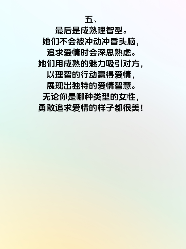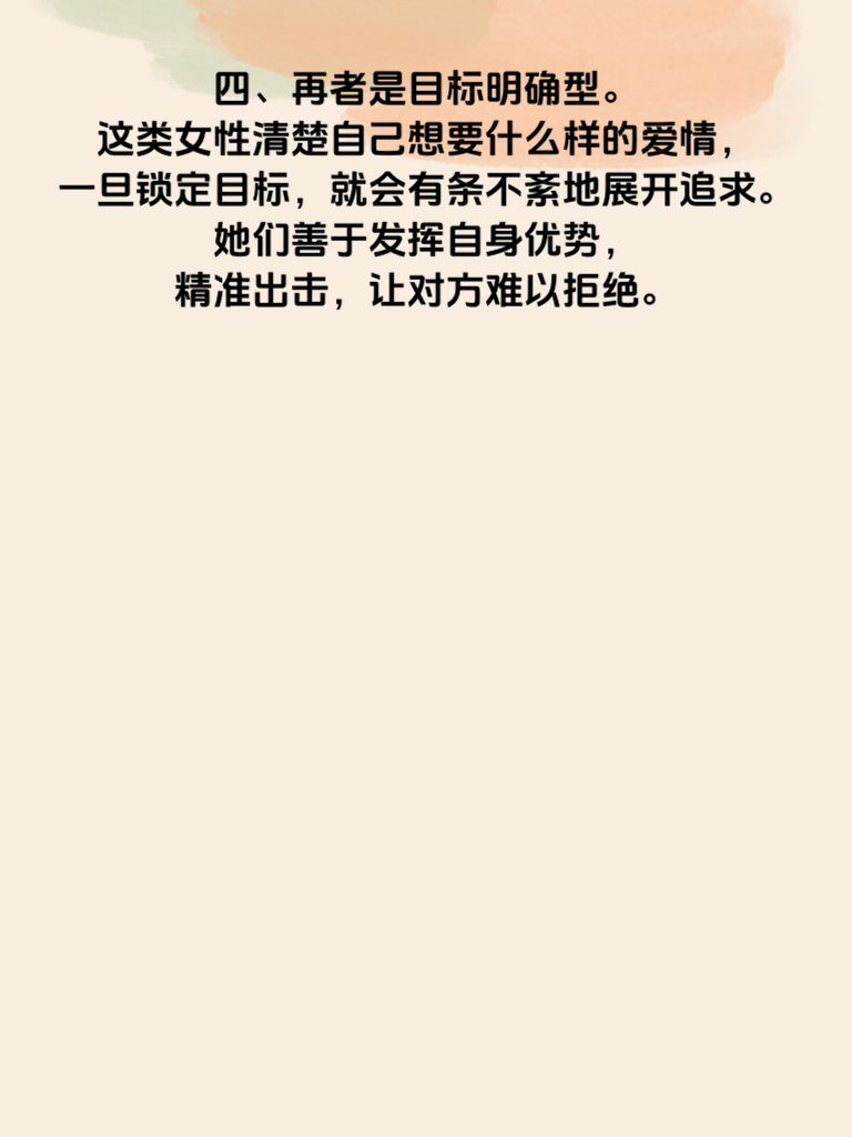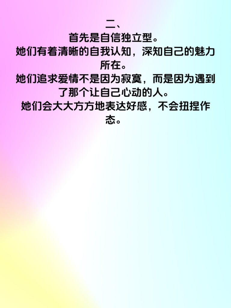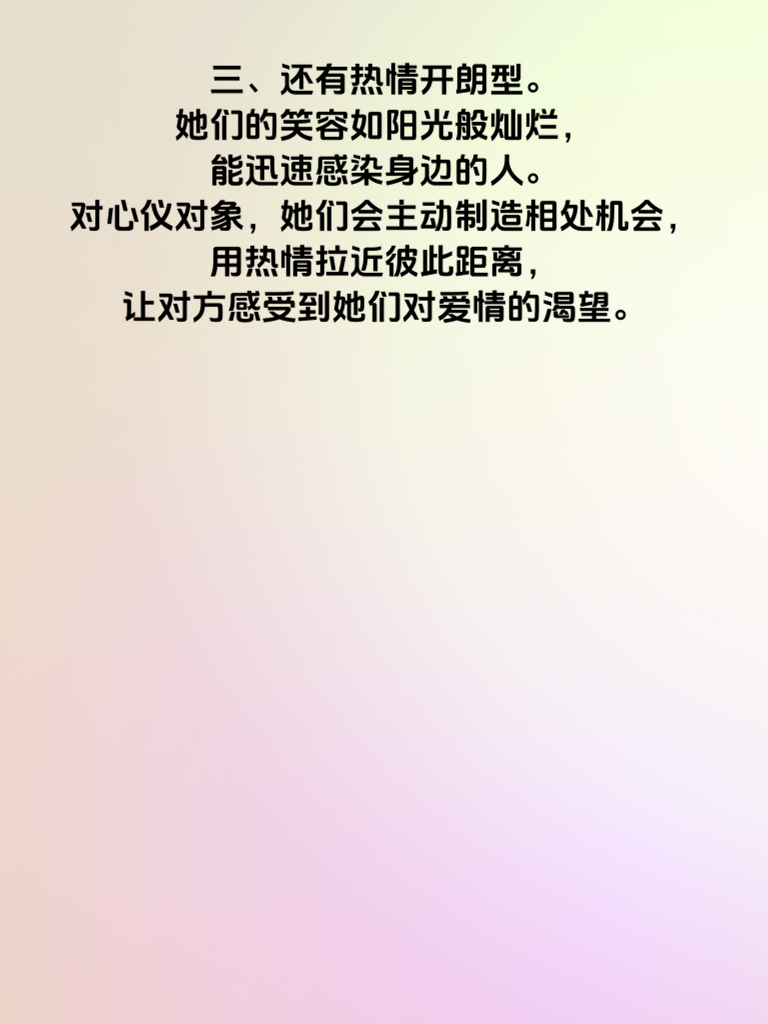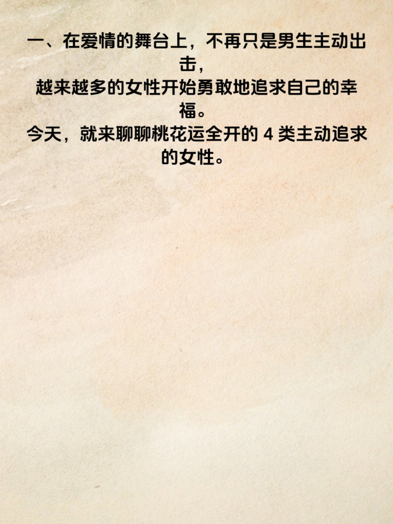 一、在爱情的舞台上,不再只是男生主动出击,越来越多的女性开始勇敢地追求自己的幸福。今天,就来聊聊桃花运全开的4类主动追求的女性。 二、首先是自信独立型。她们有着清晰的自我认知,深知自己的魅力所在。她们追求爱情不是因为寂寞,而是因为遇到了那个让自己心动的人。她们会大大方方地表达好感,不会扭捏作态。 三、还有热情开朗型。她们的笑容如阳光般灿烂,能迅速感染身边的人。对心仪对象,她们会主动制造相处机会,用热情拉近彼此距离,让对方感受到她们对爱情的渴望。 四、再者是目标明确型。这类女性清楚自己想要什么样的爱情,一旦锁定目标,就会有条不紊地展开追求。她们善于发挥自身优势,精准出击,让对方难以拒绝。 五、最后是成熟理智型。她们不会被冲动冲昏头脑,追求爱情时会深思熟虑。她们用成熟的魅力吸引对方,以理智的行动赢得爱情,展现出独特的爱情智慧。无论你是哪种类型的女性,勇敢追求爱情的样子都很美!