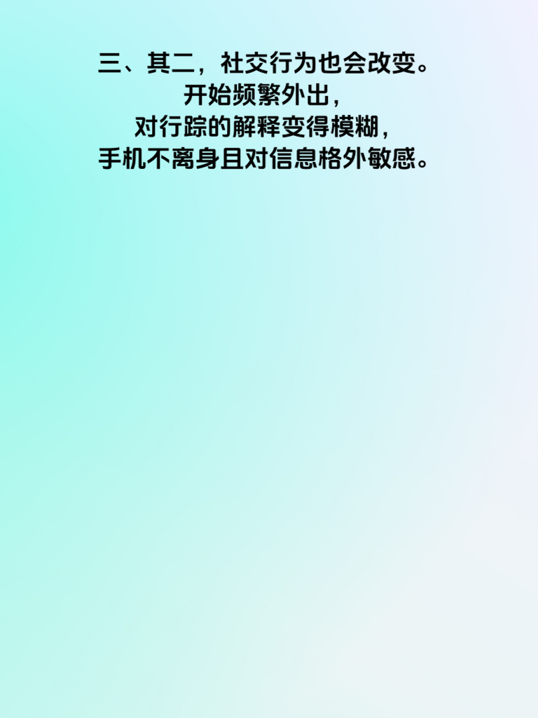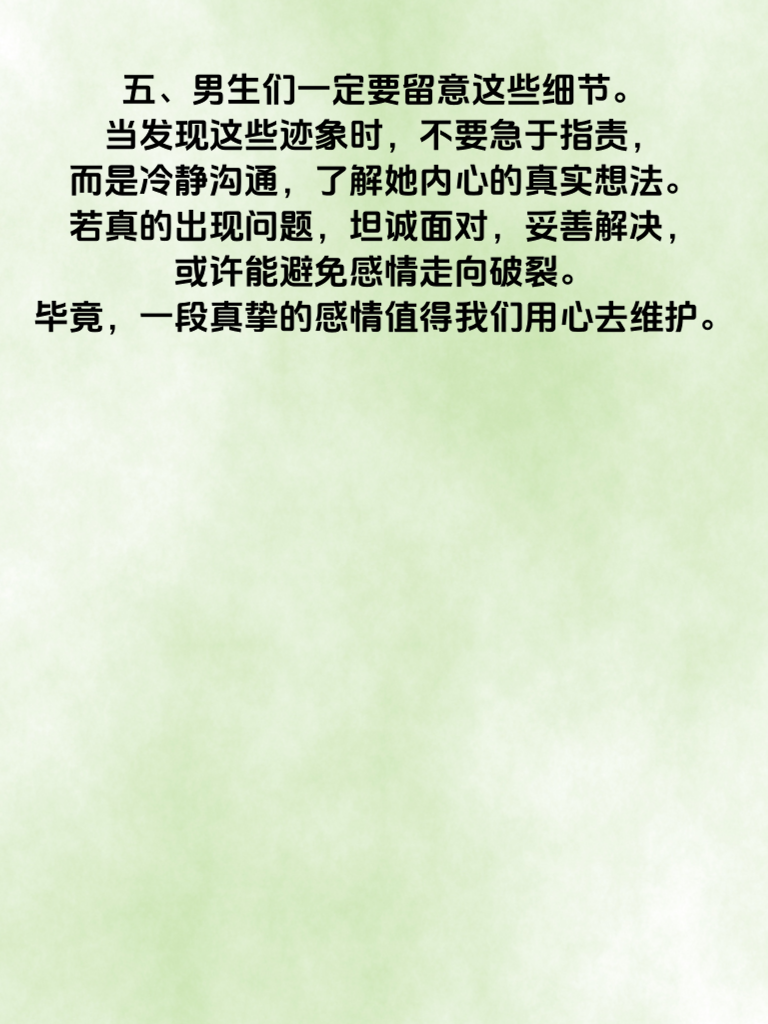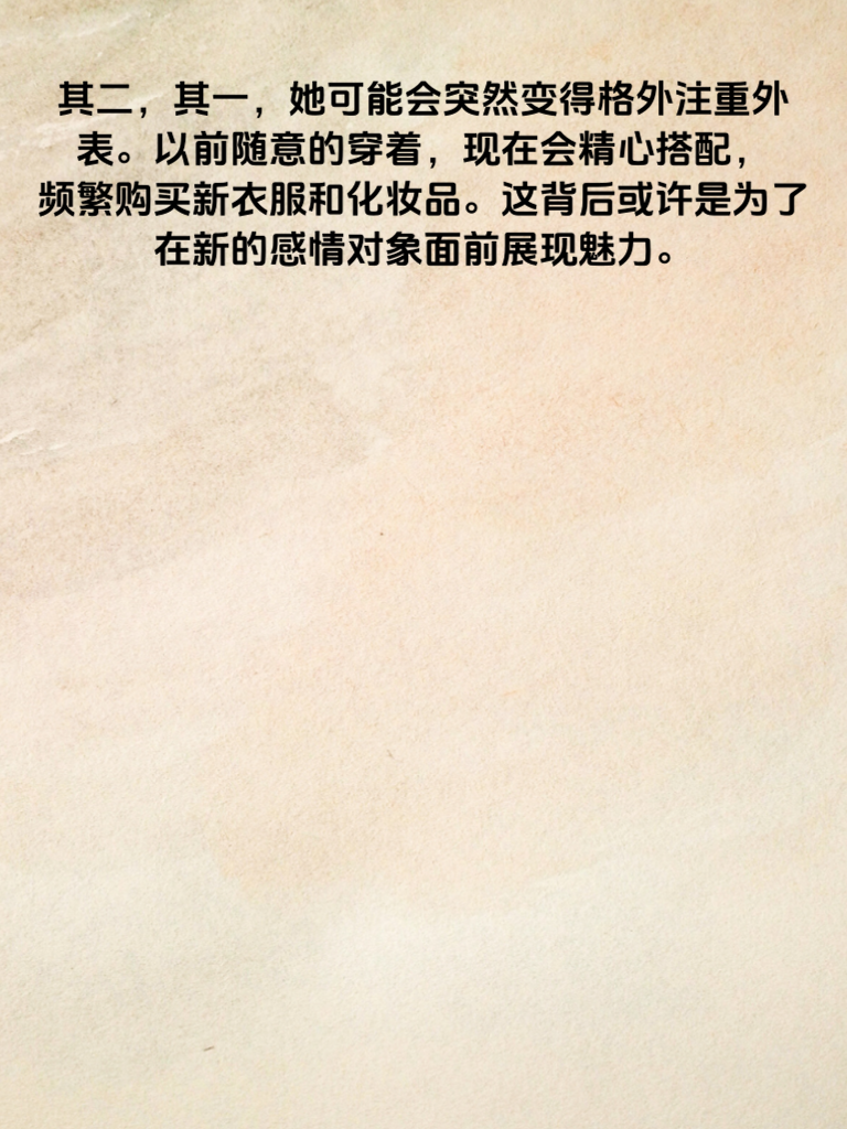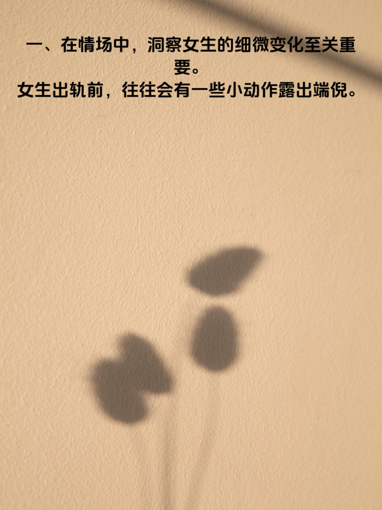 一、在情场中,洞察女生的细微变化至关重要。女生出轨前,往往会有一些小动作露出端倪。 二、其一,她可能会突然变得格外注重外表。以前随意的穿着,现在会精心搭配,频繁购买新衣服和化妆品。这背后或许是为了在新的感情对象面前展现魅力。 三、其二,社交行为也会改变。开始频繁外出,对行踪的解释变得模糊,手机不离身且对信息格外敏感。 四、其三,情感态度也悄然生变。对伴侣的关心减少,不耐烦增多,不愿再分享日常,甚至会无端找茬吵架。 五、男生们一定要留意这些细节。当发现这些迹象时,不要急于指责,而是冷静沟通,了解她内心的真实想法。若真的出现问题,坦诚面对,妥善解决,或许能避免感情走向破裂。毕竟,一段真挚的感情值得我们用心去维护。