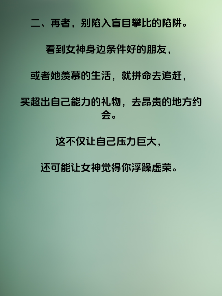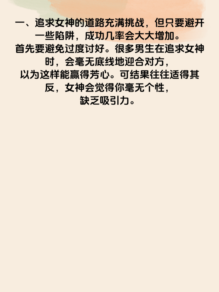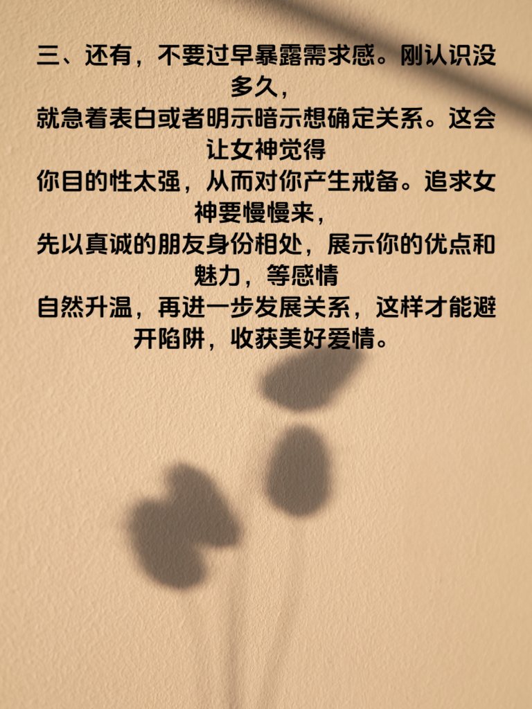 一、追求女神的道路充满挑战,但只要避开一些陷阱,成功几率会大大增加。首先要避免过度讨好。很多男生在追求女神时,会毫无底线地迎合对方,以为这样能赢得芳心。可结果往往适得其反,女神会觉得你毫无个性,缺乏吸引力。 二、再者,别陷入盲目攀比的陷阱。看到女神身边条件好的朋友或者她羡慕的生活,就拼命去追赶,买超出自己能力的礼物,去昂贵的地方约会。这不仅让自己压力巨大,还可能让女神觉得你浮躁虚荣。 三、还有,不要过早暴露需求感。刚认识没多久,就急着表白或者明示暗示想确定关系。这会让女神觉得你目的性太强,从而对你产生戒备。追求女神要慢慢来,先以真诚的朋友身份相处,展示你的优点和魅力,等感情自然升温,再进一步发展关系,这样才能避开陷阱,收获美好爱情。