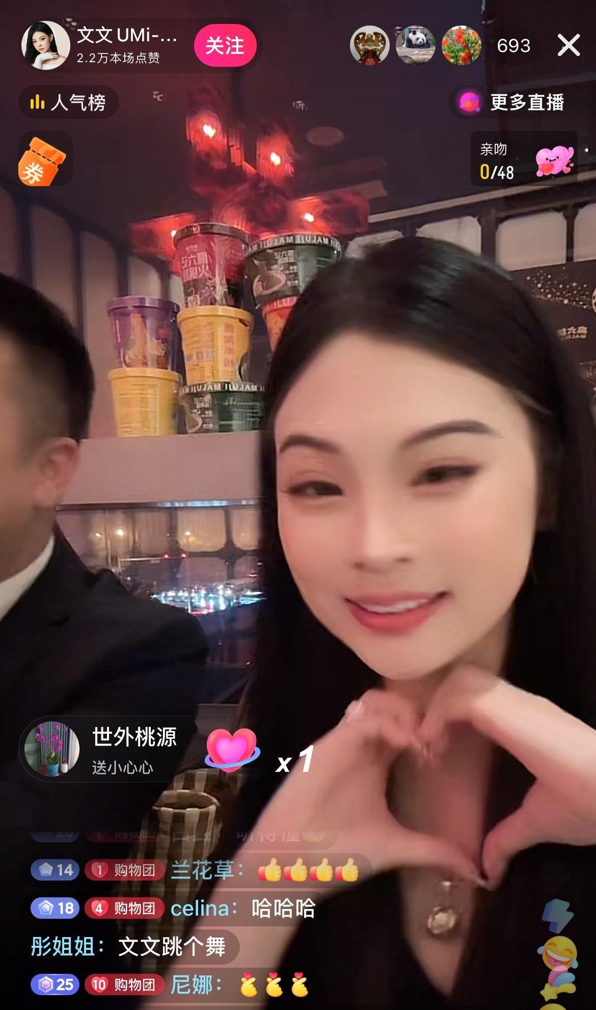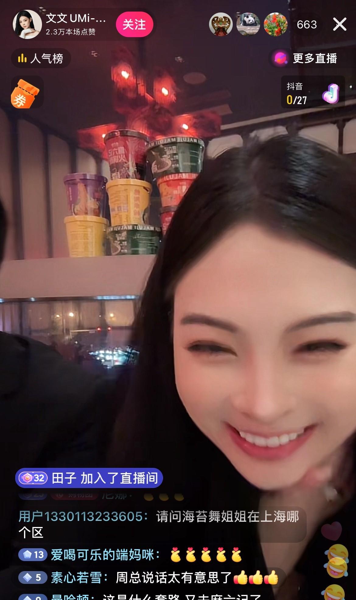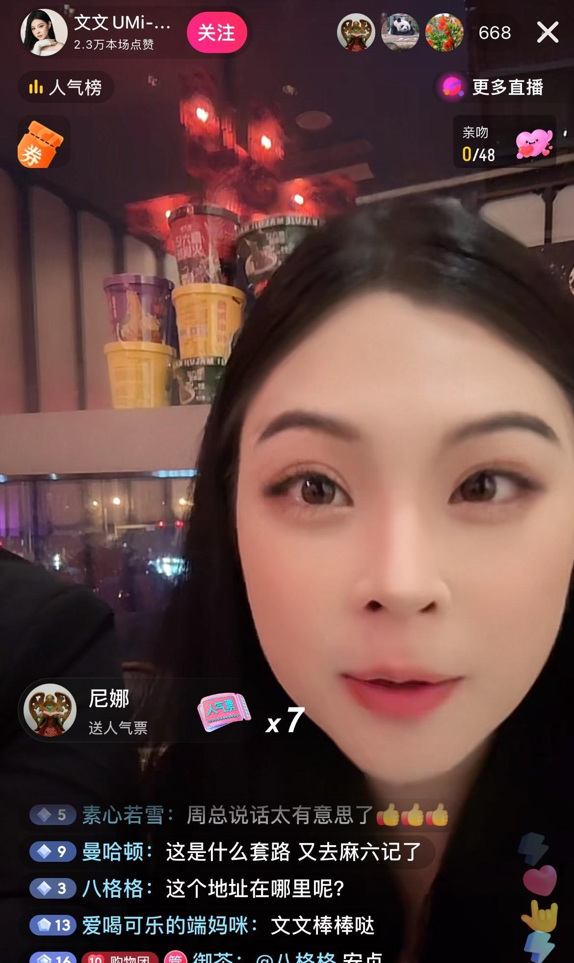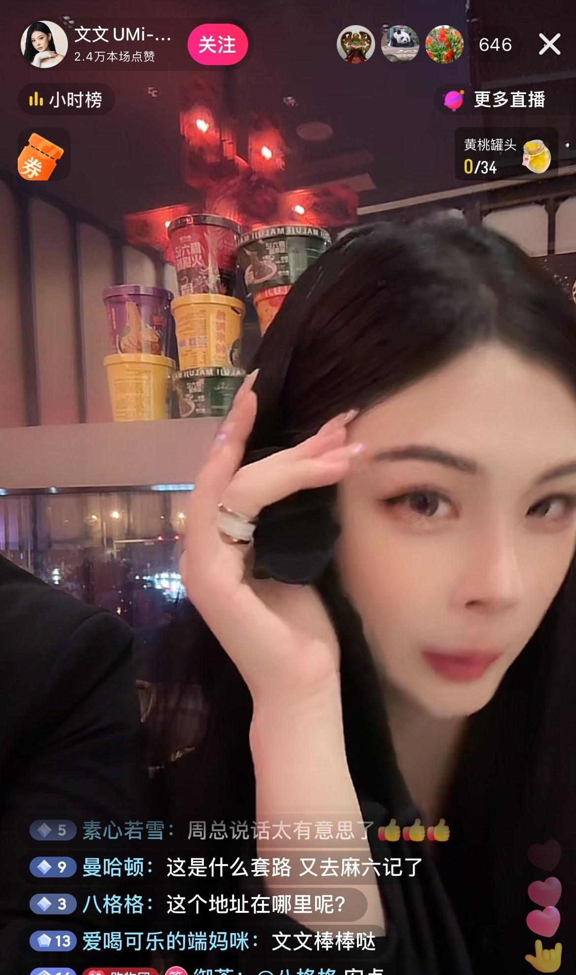 我发觉一件事, 湛蓝家的文文可真够精明的。 或许是知晓最近张兰复出直播流量不错的缘由, 她今天在麻六记安贞店做直播呢, 先是边吃边播, 而后又跟安贞店的负责人一块儿播。 瞧啊,文文那叫一个高兴, 好心情简直都要从屏幕里满溢出来了。 也怪不得文文这么开心, 前几天直播的时候也就100 - 200人, 现在直播间都有600 - 700人了。 文文也是个厉害人物, 她自己透露被劝退离职, 却还能不计前嫌继续给麻六记带货。 网友调侃:文文平常看起来有点人来疯,但懂得权衡利弊,果然穷人家的孩子会审时度势。