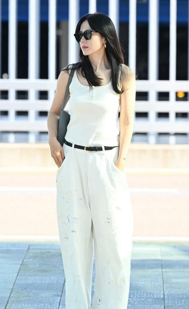#孙艺珍现身机场奔赴威尼斯电影节,状态堪称一绝! 今日仁川机场,孙艺珍身着一身白色休闲装亮相,简约白色背心搭配牛仔裤,腰间黑色腰带巧妙勾勒出纤细腰肢,脚蹬精致高跟鞋,灰色包包为整体造型添一抹低调质感,尽显优雅时尚。面对粉丝与媒体,她笑意盈盈,亲和力拉满,43岁状态超绝,松弛感十足!