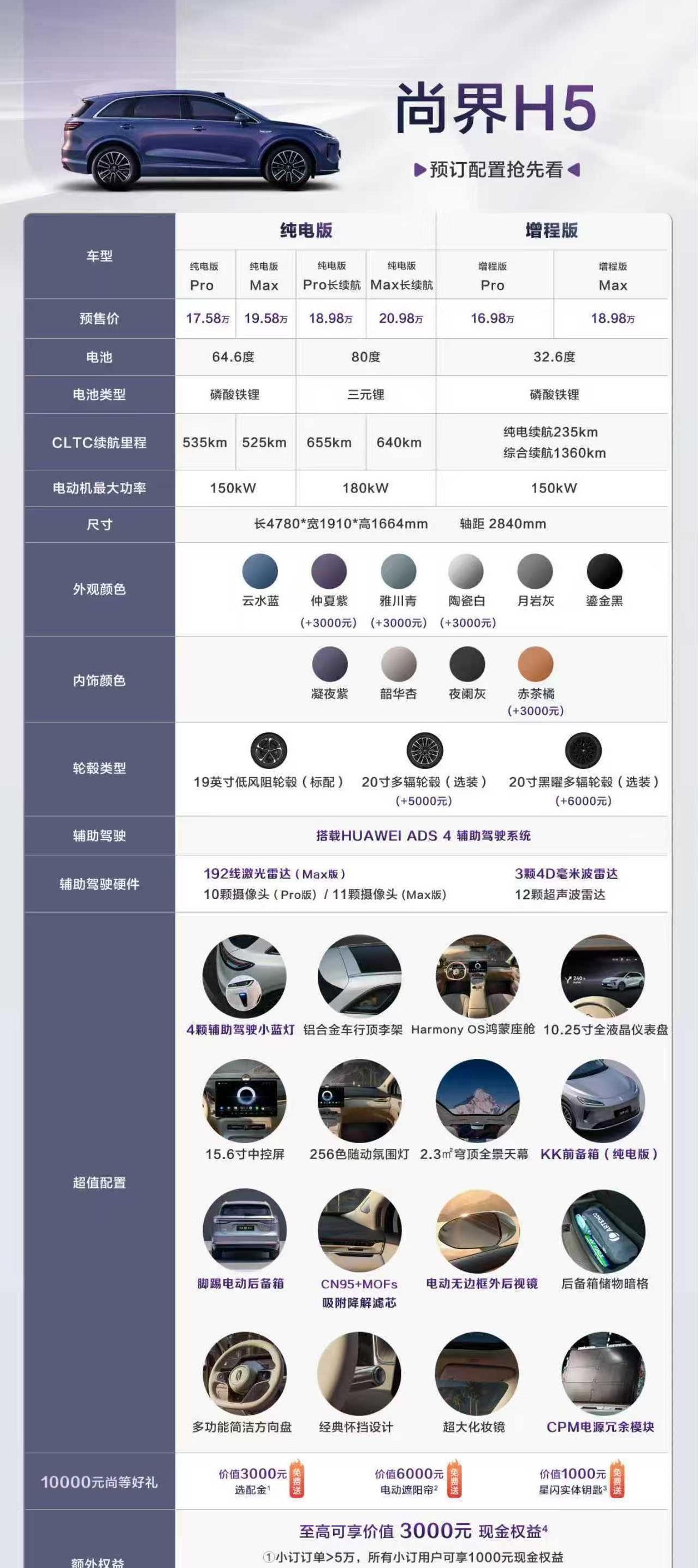 余承东已经彻底失控了!尚界H5发布会开完3天之后,我质疑过18个小时50000台的订单!也质疑过16.98万起步的价格和配置,但是当余承东在发布会上说:尚界H5搭载的这块宁德时代定制开发的长寿命三元锂电池,开8年48万公里,电池健康度仍能保证至少在80%以上 说句难听的,其实大家都是心知肚明的!本身16.98万的价格其实只是一个幌子,因为真正开售的价格肯定是会低一万,直接到15.98万基本上也是板上钉钉的事实了。但是再看配置没有缩水,这才是最让人惊讶的 主要是你看标配了ADS4.0智能驾驶辅助的功能!同时虽然说是标配16万多不便宜,但是起步就有32.6度的电池,续航235km!综合续航1360km,这个时候才是真正的王炸,因为这个价位,别说搭载华为智能驾驶,就算是有激光雷达的都屈指可数。但是尚界H5D用的则是192线华为自研的激光雷达,而且还有3颗4D毫米波雷达 怎么说呢!车子好不好其实数据是最有说服力的,18个小时50000台本质上来说已经创了问界,享界,智界等之前的记录。更何况余承东和上汽这次联合就是铁了心找不痛快的,你让友商怎么活呢!说白了现在国产新能源的价格都一个比一个价格高,但是华为反而是想到了低价策略。关键是让喜欢和认可华为智能驾驶辅助功能的伙伴有了入手的机会,同时华为的ADS4就是真正的独一份第一梯队。扪心自问说不喜欢是假的,各位怎么看