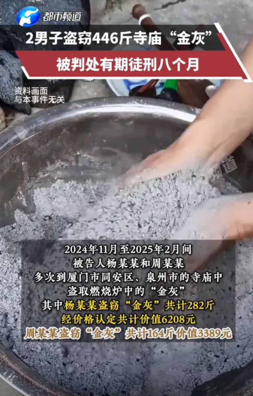 离了大谱!福建厦门,两男子到寺庙里偷东西,但他们既没有偷那些金牌金佛,也没有偷那功德箱里的钱,而是扒了寺庙燃烧炉中的灰,一年下来两人共扒了446斤。更让人难以置信的是,案发后两人还被判了刑,只因为这灰全是“金灰”。
