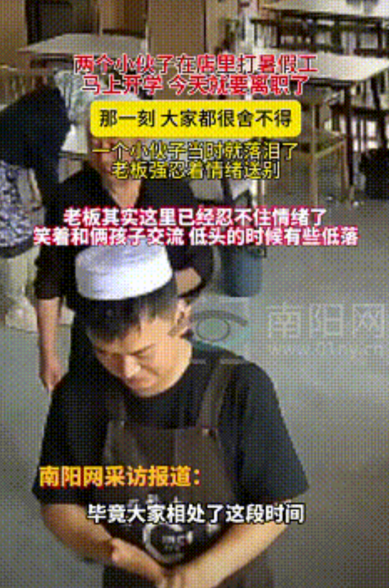 破防了!甘肃,2个男生在餐厅打暑假工,由于要开学了,他们提出了离职,没想到,老板有点舍不得,亲自下厨为他们做了最后一顿饭,算工资时,2个男生都哭了!可见老板平时对他们肯定很好,不料,两个男生又用工资,买了2箱牛奶送给老板!网友:这样的老板生意不火天理难容! 最近甘肃酒泉一家社区餐厅的事儿,刷爆了不少人的朋友圈!俩大学生打暑假工要开学离职,老板舍不得还亲自下厨做“告别宴”,算工资时男生们当场红了眼。 原来两名男生,一个叫小杨,一个叫小周,都是学生,暑假没回家,想着找份兼职赚点学费,也给家里减轻点负担。 俩人逛社区的时候,看到这家开了五六年的家常菜馆贴了“招暑假工”的启事,老板是个40多岁的大叔,姓王,说话带着西北人特有的实在,问清楚俩人是学生,没多挑就招了进来。 接下来一个多月,俩男生把餐厅当成了“第二个家”。每天早上9点到店,先帮着擦桌子、摆碗筷,中午饭点忙得脚不沾地,端菜、收碗、擦油垢,连后厨阿姨切菜缺人手,他们也会主动搭把手。 小杨记得有次下雨天,店里来了位拄拐杖的老奶奶,他赶紧跑过去扶着老人找座位,还帮老人把淋湿的外套挂在通风处,这一幕被王老板看在眼里,晚上关店时特意多给俩人加了份卤蛋,说“懂得照顾人,这蛋你们该得的”。 还有次小周发烧没说,干活时脸色发白,王老板瞅着不对劲,硬拉着他坐下歇着,自己去后厨煮了碗姜汤,还放了两颗冰糖,“趁热喝,别硬扛,身体要紧”。 眼看离开学日期越来越近,俩男生心里犯了嘀咕,这段时间王老板待他们太好,没扣过一次工资,加班还会给他们算加班费,甚至偶尔家里做了包子、饺子,也会带来给他们当加餐,现在提离职,怕老板不高兴。 犹豫了两天,俩人趁着晚上关店后,磨磨蹭蹭走到王老板跟前,小杨先开的口:“王叔,我们下周要开学了,想跟您说声,这几天就不去了……” 话没说完,王老板就摆了摆手,笑着说:“我早琢磨着你们快开学了,我现在给你们算工资。” 算过工资以后,小周因为不舍泪水在眼眶里打转,王老板看见后赶紧给他俩拿了瓶水,怕自己也控制不住情绪,转身走进厨房说:“再给你们做顿饭吧!” 厨房里传来切菜、烧油的声响,不一会儿,香味就飘了出来,都是俩男生平时爱吃的菜,吃饭的时候,王老板不停给他们夹菜,还叮嘱:“到了学校好好上课,别总想着省钱,不够了跟家里说,要是放假还想打工,随时来我这儿。” 后来,俩男生没直接回学校,而是拿着刚拿到的工资,去附近的超市挑了两箱纯牛奶,扛着就往餐厅跑。当时王老板正在擦玻璃,看到他俩又回来,还扛着牛奶,愣了一下。 “叔,您平时总说看店到半夜,熬得慌,这牛奶您早上热着喝,补补身子。”小杨把牛奶放在柜台边,拉着小周就往外走,怕王老板再推辞。 王老板追到门口,看着俩人跑远的背影,手里攥着牛奶箱,眼眶也红了,嘴里念叨着:“这俩孩子,真是……” 这事被餐厅里的老顾客拍下来发到网上,很快就火了。网友评论里满是感动: 有网友说:“看哭了!好老板遇着懂事的孩子,这才是人与人之间该有的样子!这家店要是在我家附近,我天天去吃!” 也有网友说:“现在多少老板雇学生工就想着压榨,王老板这格局太大了,不仅给足工资还额外发红包,生意不火天理难容!” 其实这件事,让我们看清了人与人之间最珍贵的东西,善意从来都是双向的。王老板用真心对待暑假工,不苛刻、不敷衍,把俩男生当成自家孩子疼,而俩男生也记着这份好,用买牛奶的方式回报,没有把别人的照顾当成理所当然。 所以不管是职场里的老板和员工,还是生活中的陌生人,多一点真诚,少一点算计,多一份体谅,少一份计较,这份双向奔赴的温暖,总能让日子变得更有温度。 那么你们怎么看待这件事呢?欢迎在评论区说说你们的看法吧!