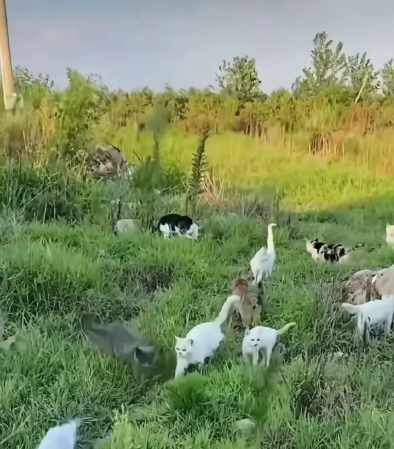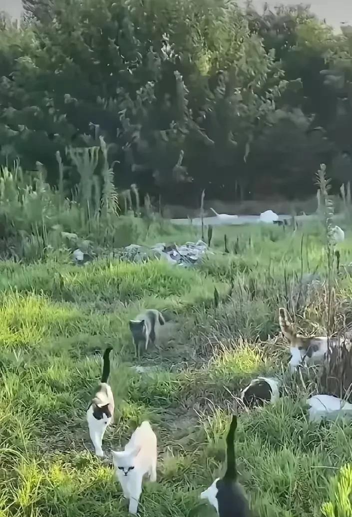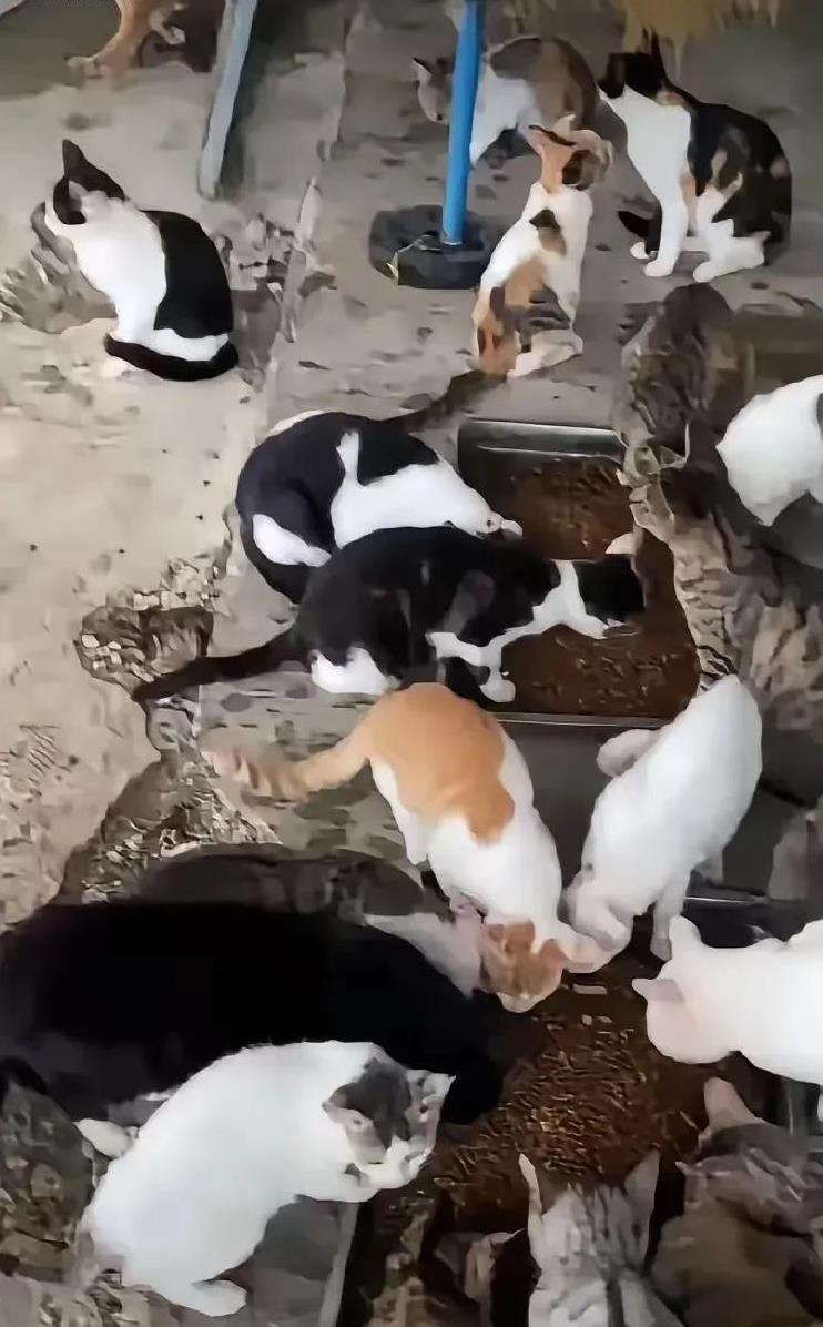夫妻俩承包了一个鱼塘,平常捉上来不好卖又吃不完的小鱼小虾就用来喂流浪猫。后来猫咪越来越多,有猫呼朋唤友喊来的,也有直接在这里生产的,现在已经有一百多只了。为了照顾好这些猫咪,不让它们风吹日晒能吃饱,夫妻俩在鱼塘边搭了一个大棚当猫窝,鱼不够吃的时候就买猫粮喂它们。
