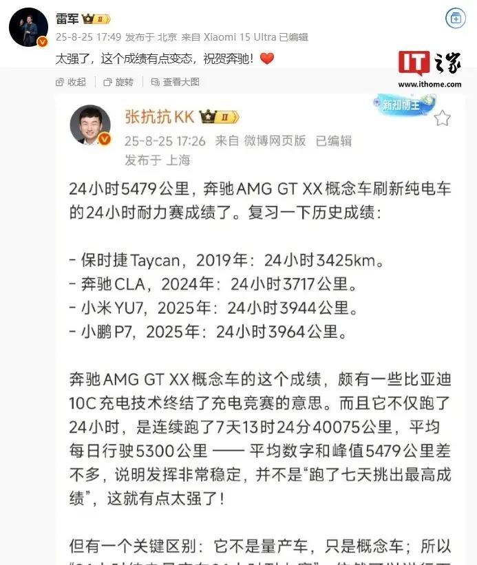 同样是破纪录,小米汽车雷军总这个操作有“深意”…… 雷总发文,祝贺奔驰概念车刷新纯电车的耐力赛成绩,直呼“变态”、并大方祝贺; 而国内新能源大厂比亚迪,相近时段曝出仰望U9工程测试车跑出了472.41km/h的巅峰速度、一举打破全球电车极速纪录。对此,雷总似乎却有点“视而不见”… 不知道,是否在雷总看来,奔驰的耐力表现才是真“牛逼”,而比亚迪的极速表现,实则没有什么技术瓶颈? 你们觉得呢?[奸笑]