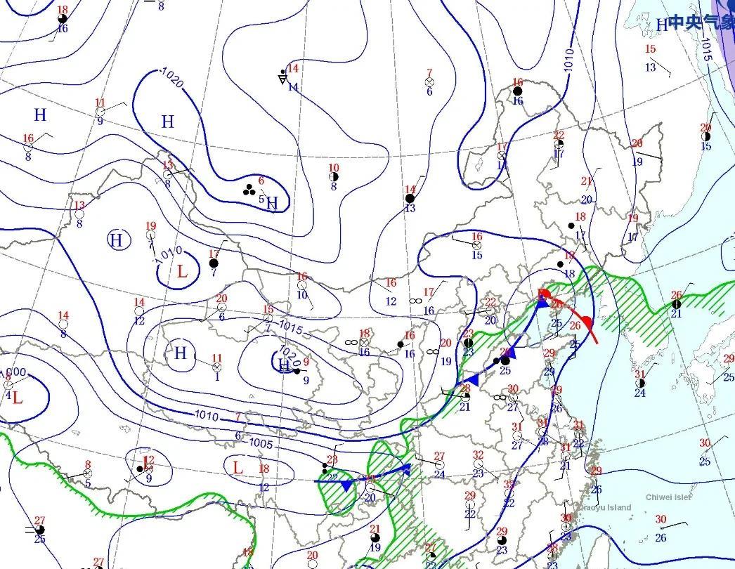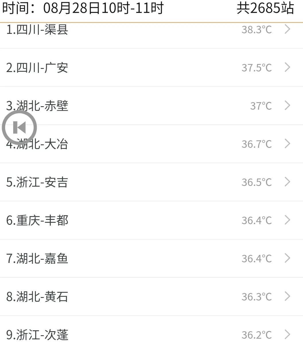 从今天的天气图实况来看,今天副热带高压主要是控制湖北、安徽、湖南、福建、浙江、江苏等中东部省份。 地面天气图来看,今天甘肃 、宁夏、陕西等,还有冷空气影响。 从上午11点到24小时温度变化情况来看,陕西咸阳降温8.3 度,陕西长安降温6.6 度 根据今天上午的最新卫星云图,今天我国南方大部分地区天气都非常晴好。 流场图显示,南海因为有一个比较弱的低值系统,目前广东珠海、江门、阳江一带云量较多。 在今天上午11点的全国温度排行榜上,四川渠县和四川广安分别以38.3 度和37.5 度的温度,位列第一和第二,重庆丰都36.4 度位列排行榜第六 虽然说重庆主城沙坪坝气象站没有上榜,但是11:15 分沙坪坝温度也达到了36 度,重庆垫江温度也有34.3 度 炎热的一天又开始了,受副热带高压的影响,大家要注注意防晒避暑。