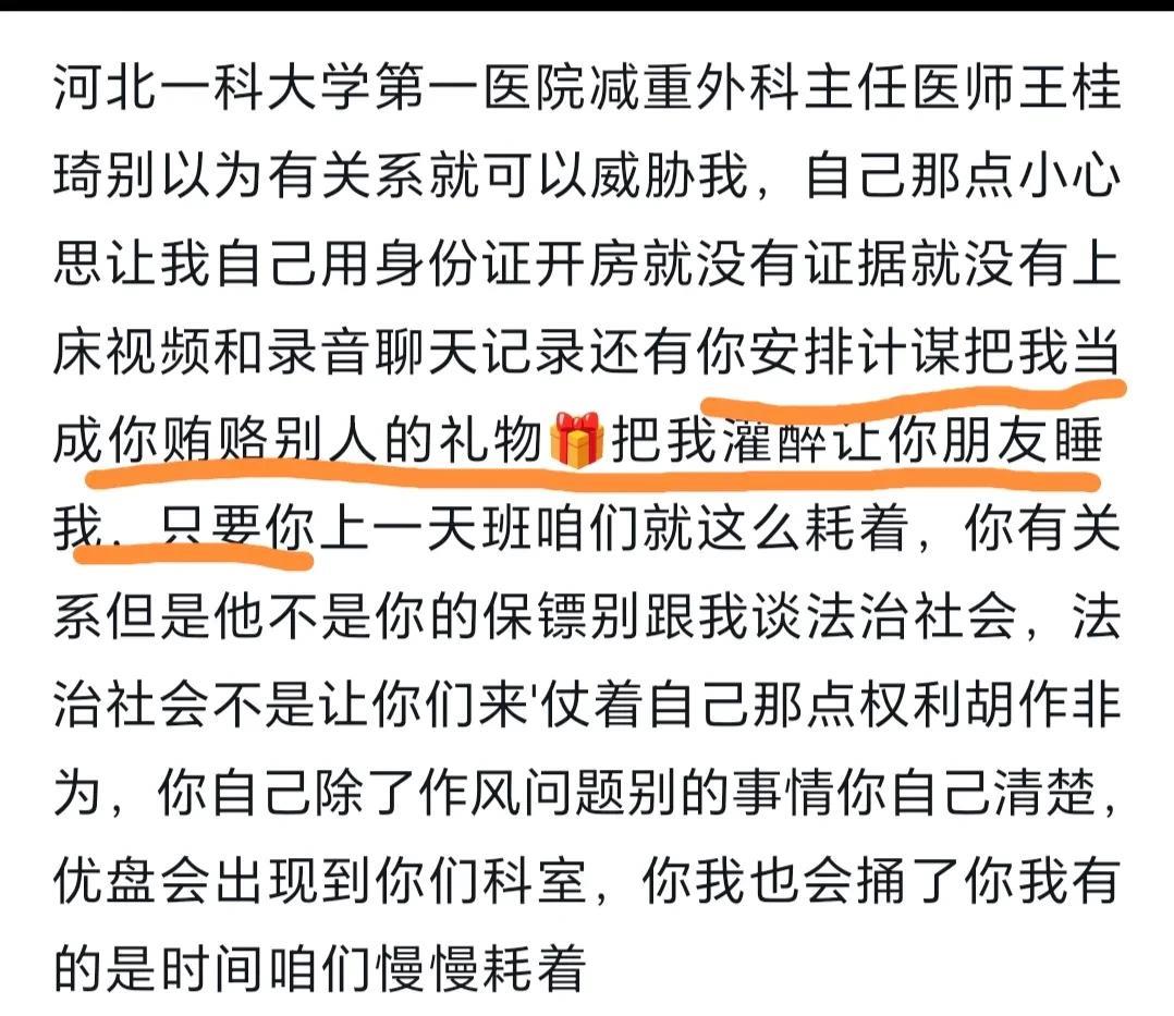 炸裂,河北一女子举报三甲医院主任医师与自己开房,还把自己灌醉和别人睡。 刚才刷到网上一位女子发文,说是举报河北医科大第一医院的主任王桂琦,他们之间有一腿,他开房还用女子的身份信息开房,看来是十分谨慎。 女子还透露,这个主任有一次把她喝醉了,还让朋友和她睡觉,这应该算是违背妇女意愿,可以告他强奸,这个主任算是从犯。 也可以看出来当初这两人是你情我愿,不知道现在因为什么原因闹掰了,还去网上发文,目前这个王主任的账号已经关闭评论了。