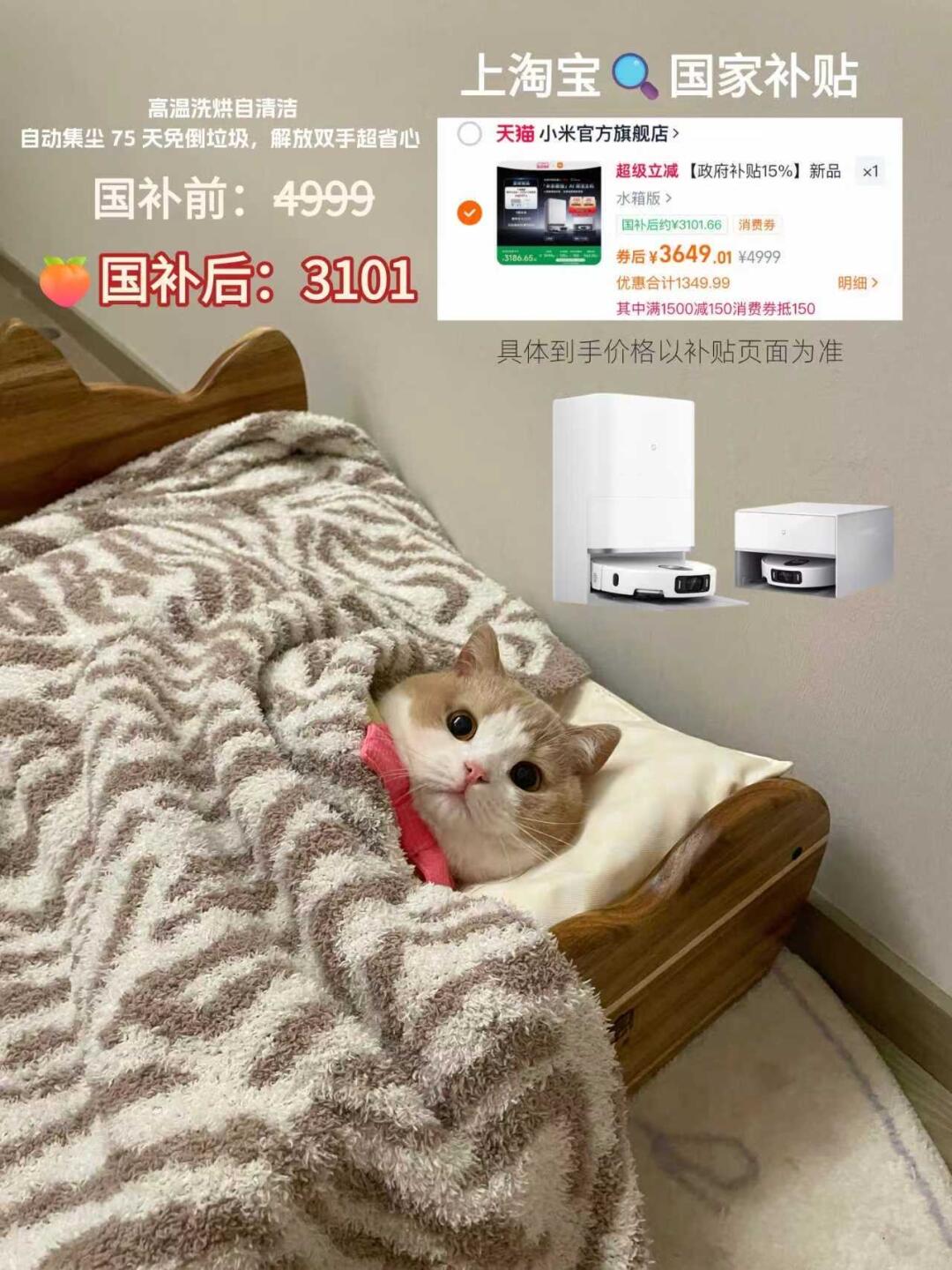 发现🍑国家补贴一直都有,立马在🍑下单了扫地机,这下就不怕家里猫毛满天飞,芋圆也可以随地大小躺啦。看到价格合适,还在🍑入手了冰箱和卡得利餐桌,省下来又可以给芋圆囤不少肉肉噜~