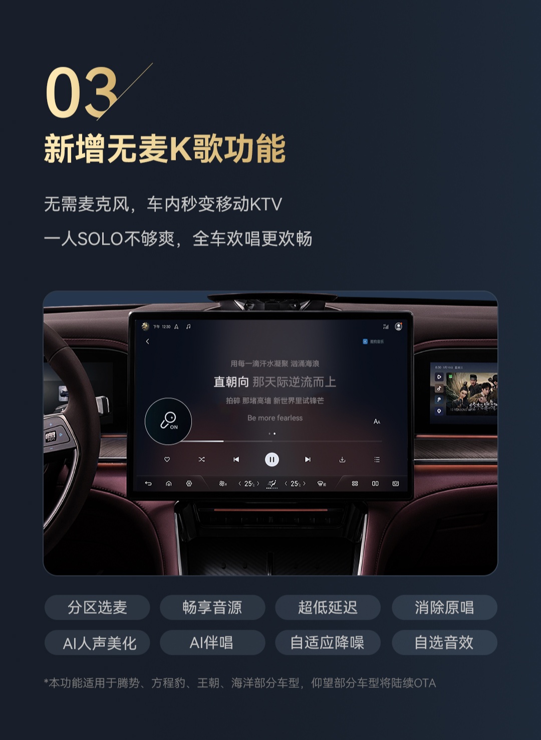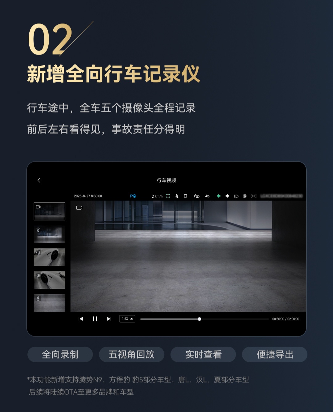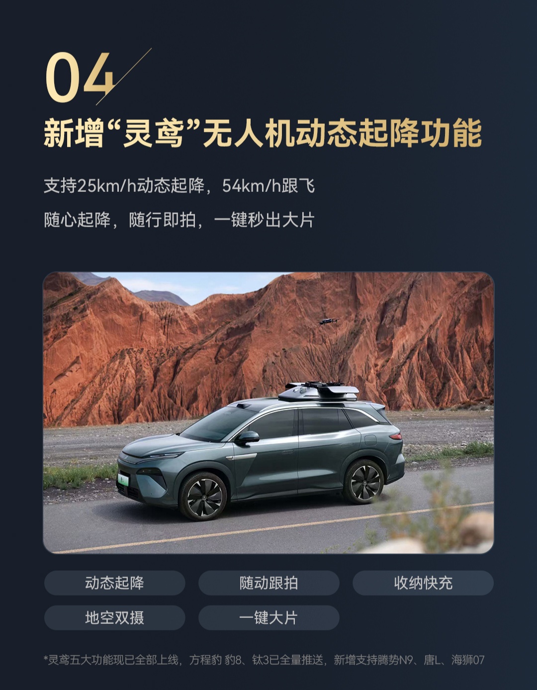 比亚迪8月OTA推送:DiLink智能座舱新增多项实用功能 2025年8月,比亚迪DiLink智能座舱迎来新一波OTA升级,多项实用功能上车,开车变得更智能、更有趣。这次主推的车道级导航真正实现了“高精指引”,能在拥堵时智能推荐最快车道,接近岔路口提前提醒变道,再复杂的路也不容易开错。全向行车记录仪调用全车五个摄像头,可同时录制前后左右多个视角,还原现场更全面,应对意外更有底气。 娱乐方面亮点颇多,无麦K歌功能接入QQ、酷狗等主流音乐App,不需麦克风,点开即唱,配合多种音效,车厢秒变K歌房。喜欢游戏的用户可在新增的游戏中心下载多款作品,支持手柄操作,车机秒变游戏主机。 更令人惊喜的是“灵鸢”无人机智能联动功能,在车速低于25km/h时可实现动态起飞和降落,54km/h内稳定跟随拍摄,一人一车一无人机,轻松创作航拍大片。 本次升级正陆续推送到腾势、方程豹、王朝、海洋及仰望等多品牌车型。比亚迪持续以“月更”节奏焕新车机体验,让科技真正融入每个出行场景。