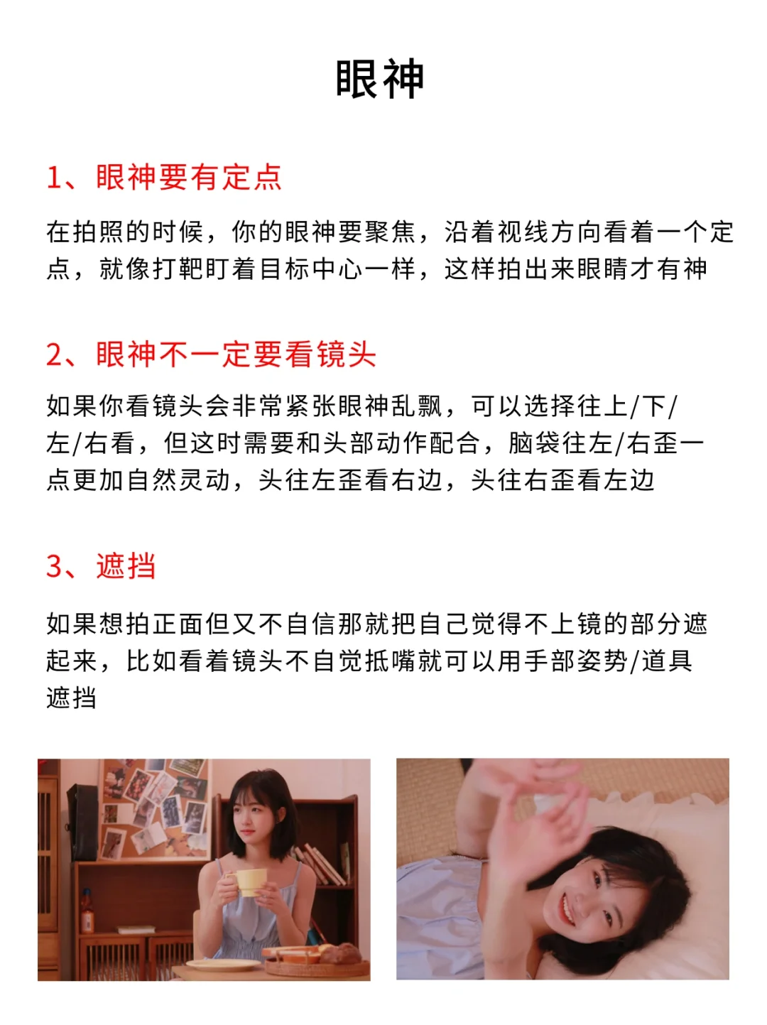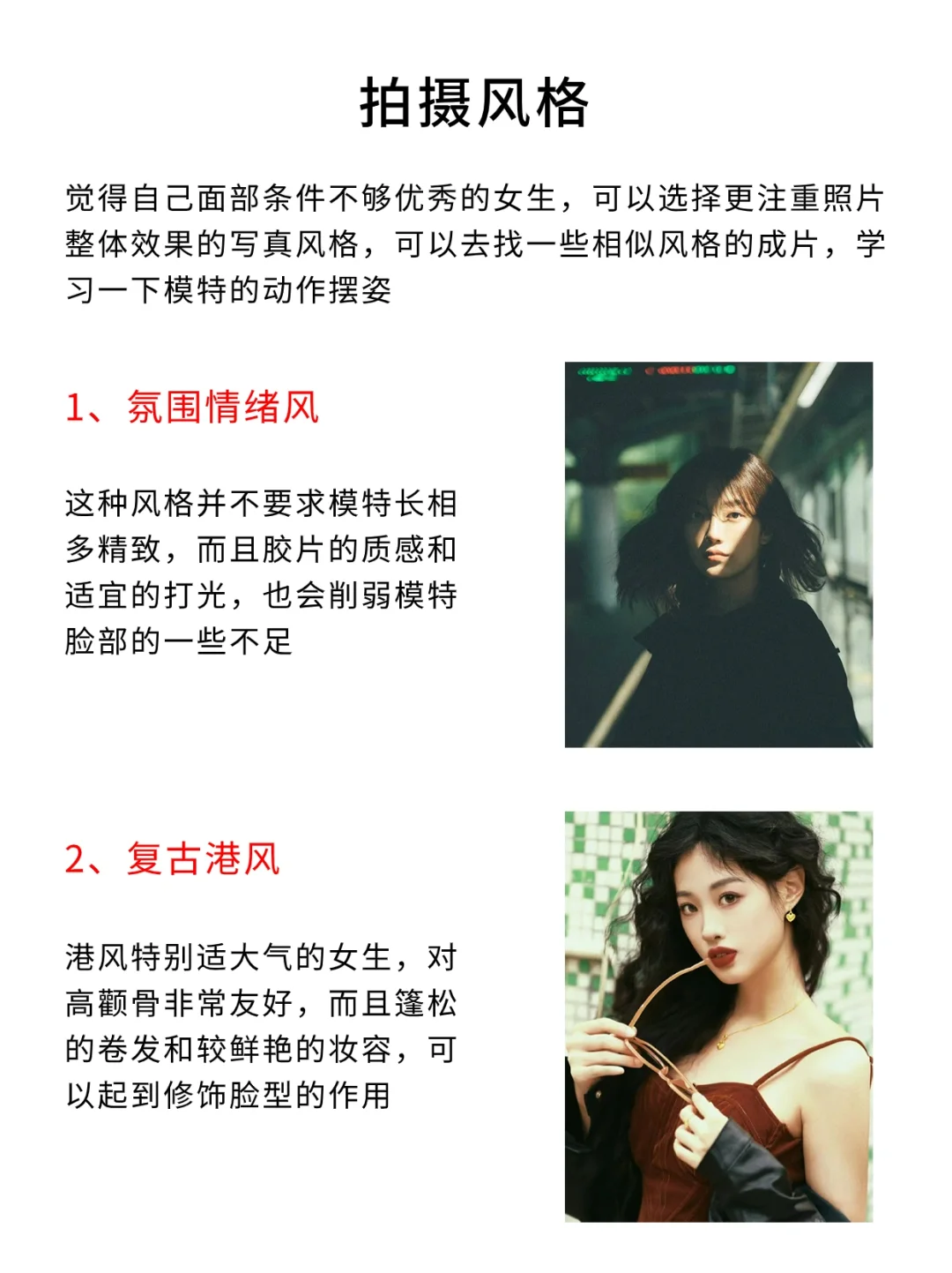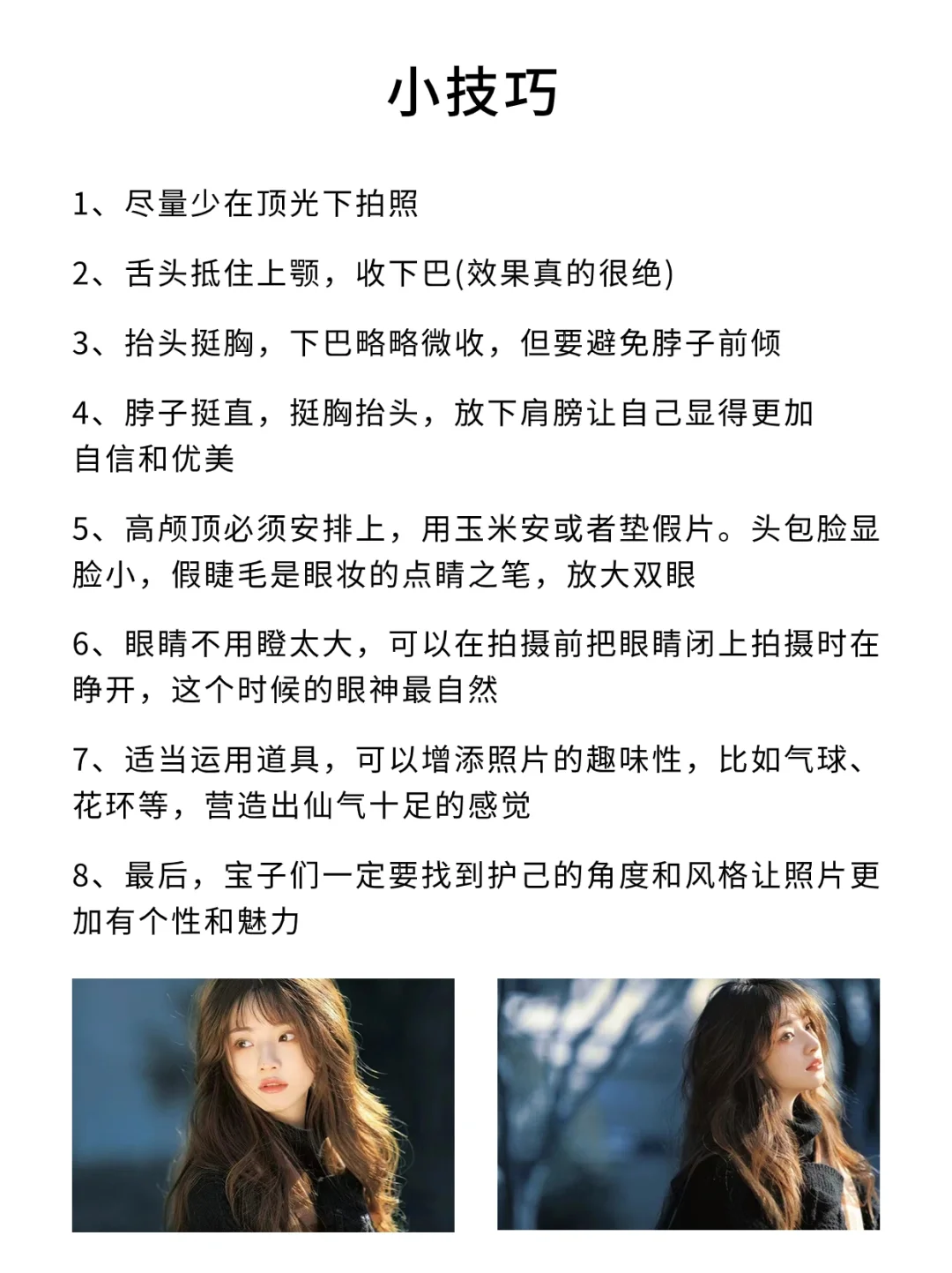 小伙伴们大家好呀,我是摄影师半夏[微笑R] - 今天给大家分享的是人像摄影上镜三要素,认真看完,小白也能轻松拍照出片‼️ - 1⃣️眼神 眼神要有定点 眼镜不一定要看镜头 遮挡 - 2⃣️面部姿态 一定不要抿嘴 将更好的一面对着镜头 利用道具 - 3⃣️拍摄风格 氛围情绪风 复古港风 光影风 日系胶片风 - 具体的内容都放在图片里啦,宝子们快去看看叭 -