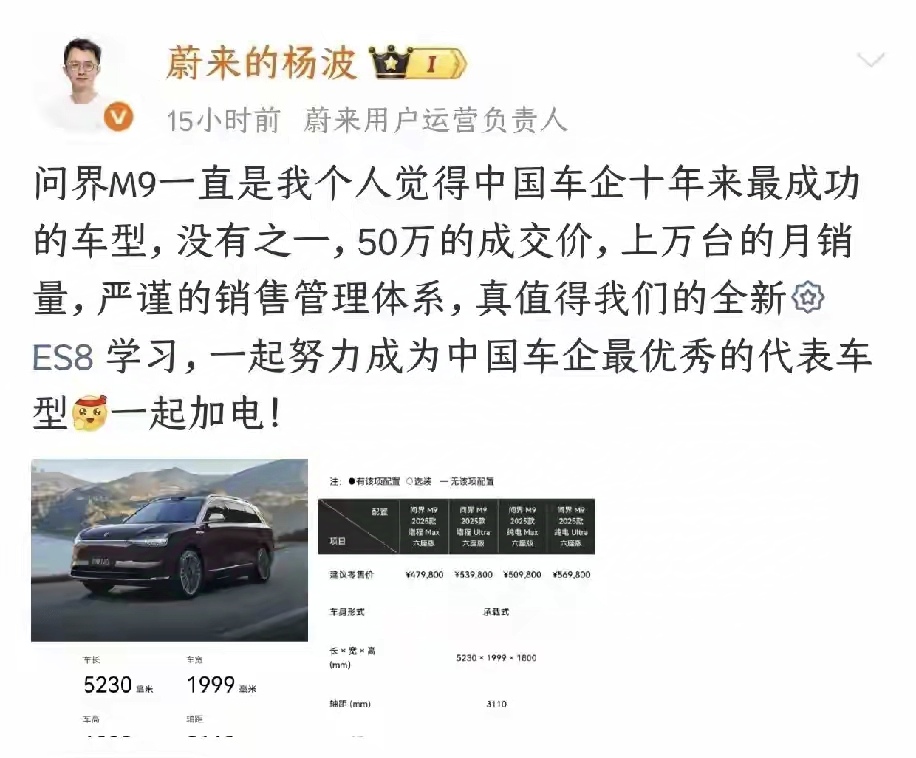 蔚来高管:问界M9是中国车企十年来最成功的车型,没有之一。