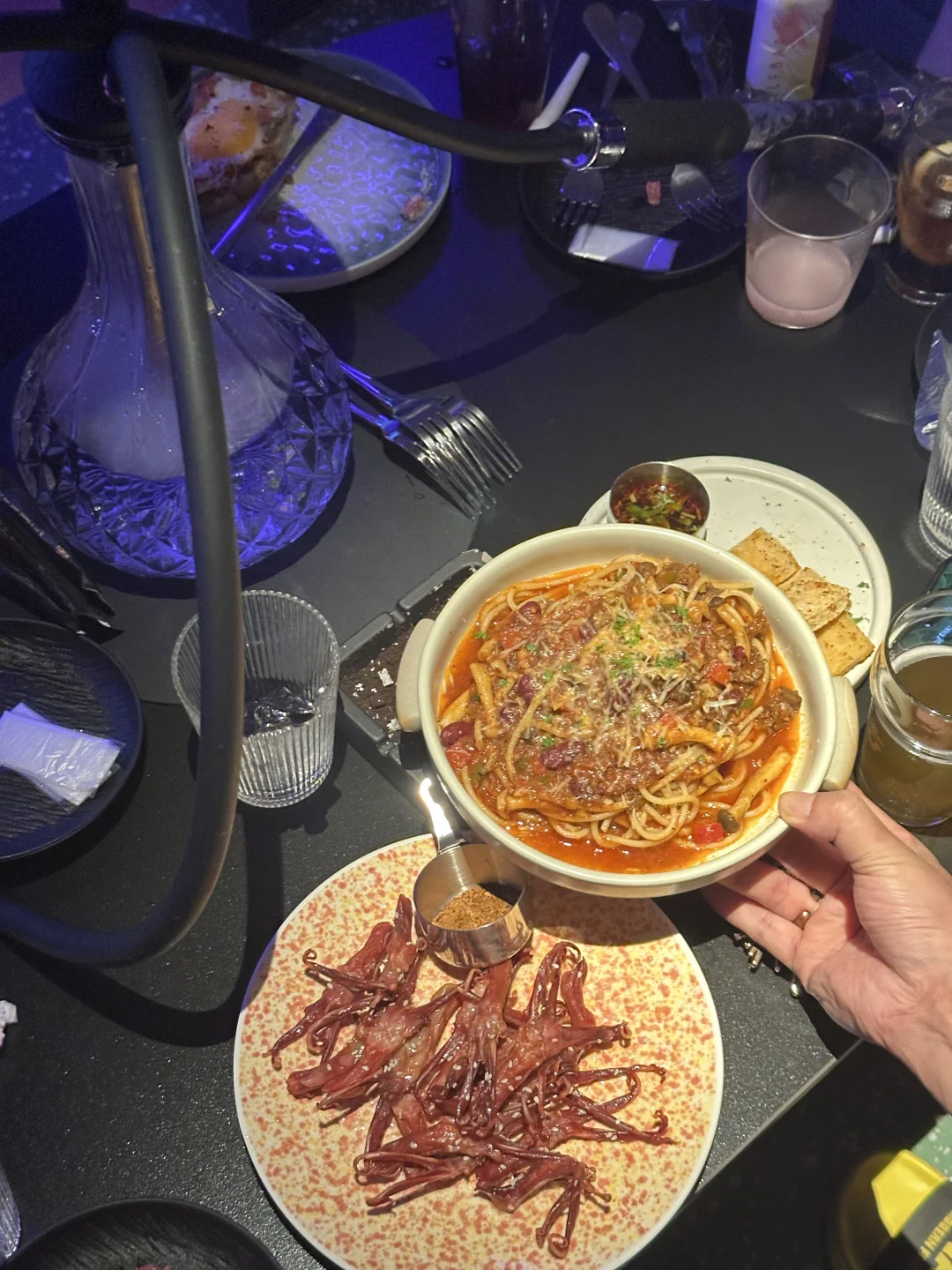 朋友带我去一家国金中心新开的清吧~八方 价格挺亲民 酒挺好喝 氛围非常不错~会有DJ打碟~🎶so nice 水烟什么必不可少! 关键关键![哇R]我觉得他家餐食小吃做的太好吃了 喝酒来点吃的就很不错 意大利面~胸口香辣胸口肉~鸭舌……都好吃 🕶️国金中心3座703~八方