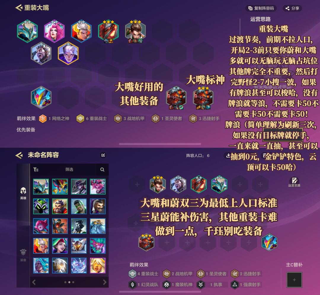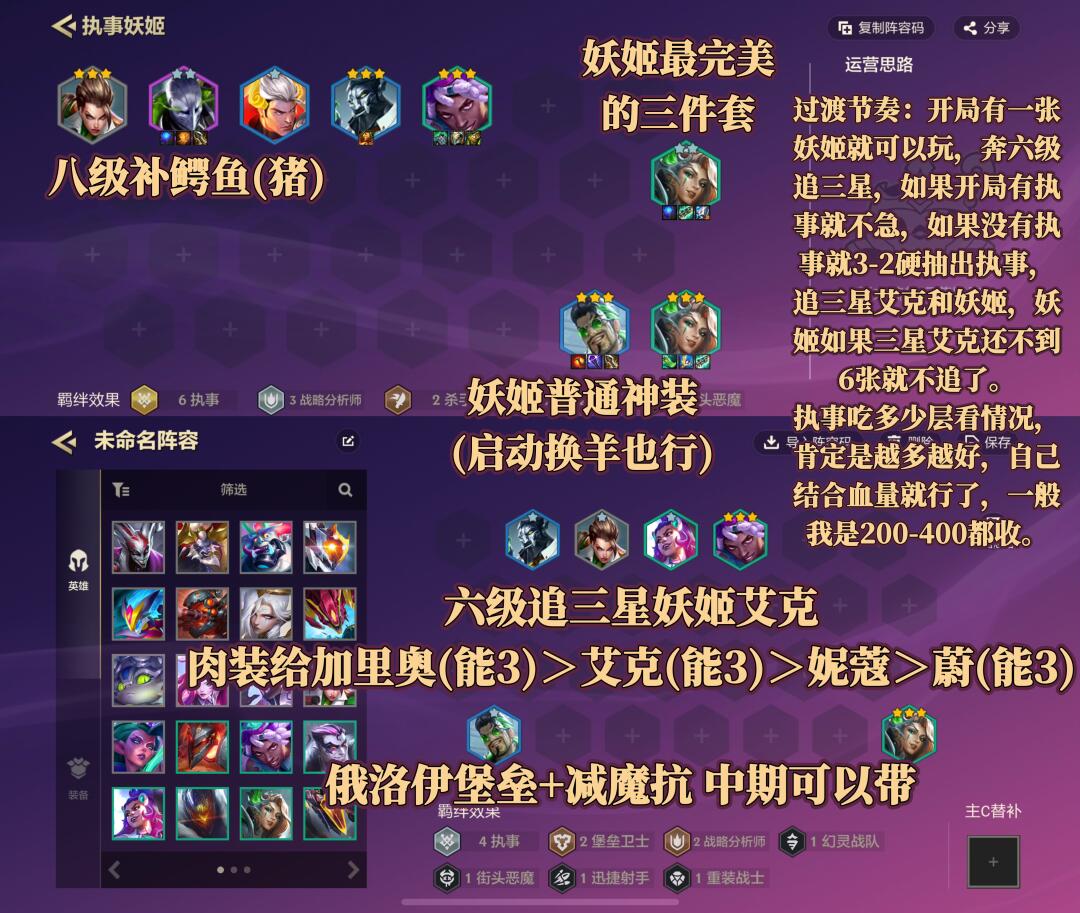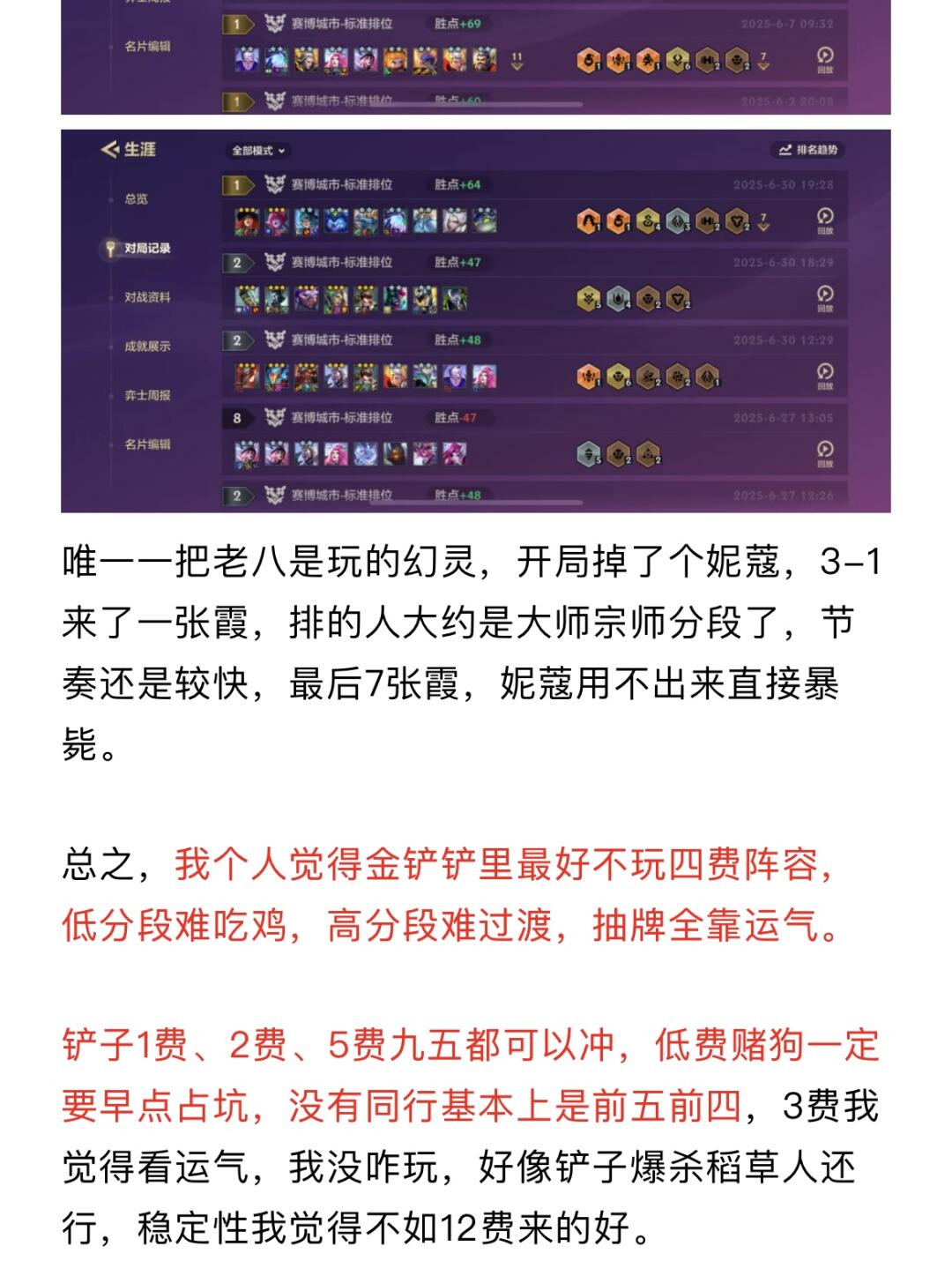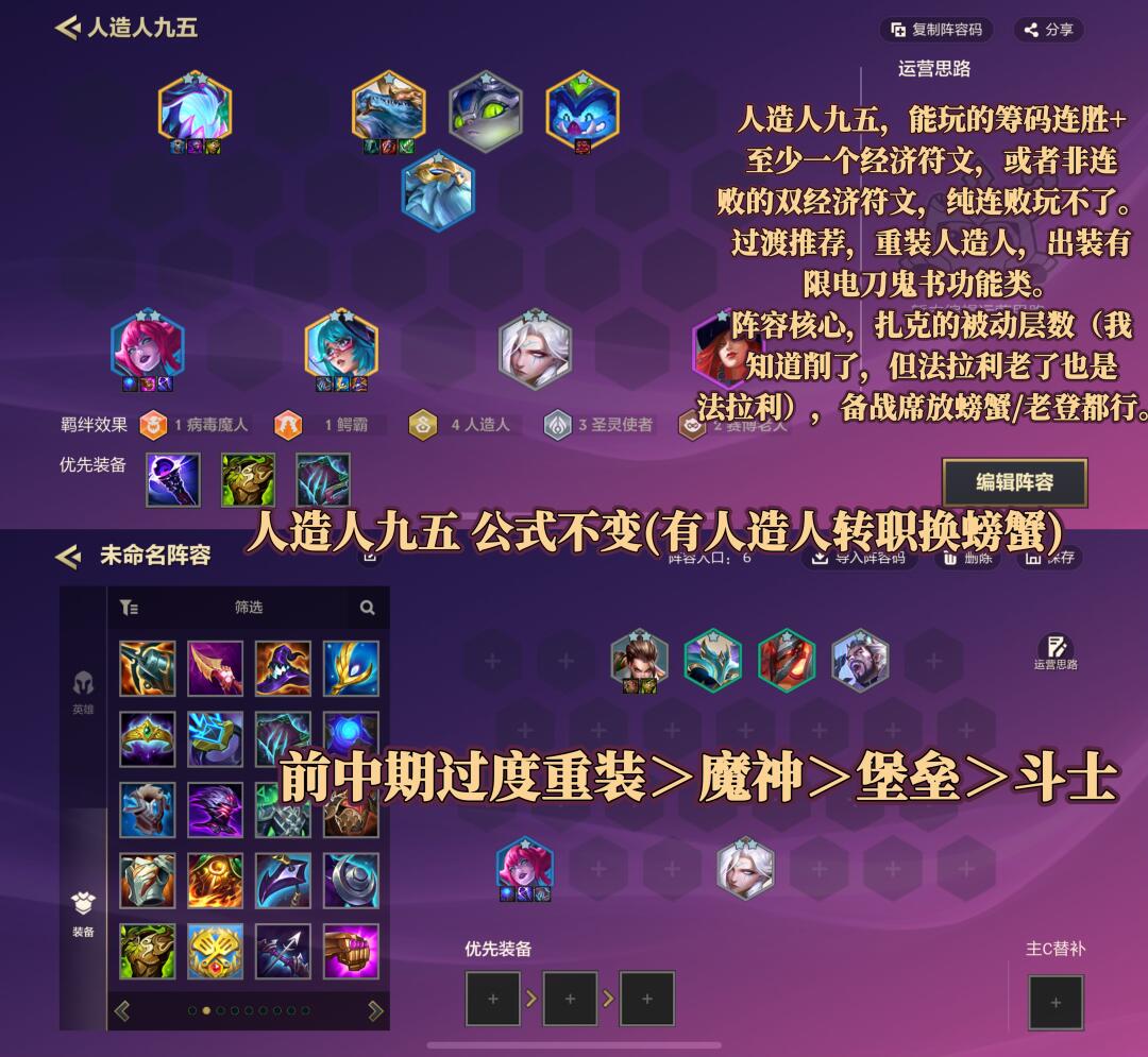 大家好,我是小猪[暗中观察R] 最近玩了玩铲子,全程用云顶的玩法思路29把从黑铁定位72%吃鸡率速通大师了,钻石以后排的对手大致为大师300-宗师600,还是有一定参考价值,分享给大家这个版本我的上分思路。 人造人九五,能玩的筹码连胜+至少一个经济符文,或者非连败的双经济符文,纯连败玩不了。 过渡推荐,重装人造人,出装有限电刀鬼书功能类。 阵容核心,扎克的被动层数(我知道削了,但法拉利老了也是法拉利),公式如上图,如果有人造人造人转职,可以丢女枪换个人造人螃蟹来打装备提上限,备战席放螃蟹/老登都行。 重装大嘴,真正意义上的黑铁到王者分段都能玩的阵容,非常强的上分阵容,核心是大嘴和蔚双三星,六重装的蔚能补非常多的伤害,否则大嘴伤害真的不够。 过渡节奏,前期不拉人口,开局2-3前只要你蔚和大嘴多就可以无脑玩无脑占坑位,其他牌完全不重要,然后打完野怪2-7小搜一波,如果有牌浪甚至可以梭哈,没有牌浪就等浪,不需要卡50不需要卡50不需要卡50,说三次! 牌浪(简单理解为刷新三次,如果没有目标牌就停手,一直来就一直抽,甚至可以抽到0元,金铲铲特色,云顶可以卡50哈) 大嘴和蔚双三星就速度上人口开6重装,上9再补个盖伦或者是阿萝拉/螃蟹啥的都行。 PS:图中两只大嘴为出装备选推荐,大嘴神器烁刃,血手,科技枪都是大嘴非常好的装备。 执事妖姬,非常简单的独家阵容,必须独家,两家玩执事容易一起拜拜。 过渡节奏:开局有一张妖姬就可以玩,奔六级追三星,如果开局有执事就不急,如果没有执事就3-2硬抽出执事,追三星艾克和妖姬,妖姬如果三星艾克还不到6张就不追了。 执事吃多少层大家看情况,肯定是越多越好,自己结合血量就行了,一般我是200-400都收。 PS:图中两个妖姬是最完美装备,蓝魔韵科技球,普通神装就青龙刀科技枪大天使吧,蓝BUFF也能用下,羊刀也OK。 唯一一把老八是玩的幻灵,开局掉了个妮蔻,3-1来了一张霞,排的人大约是大师宗师分段了,节奏还是较快,最后7张霞,妮蔻用不出来直接暴毙。 总之,我个人觉得金铲铲里最好不玩四费阵容,低分段难吃鸡,高分段难过渡,抽牌全靠运气。 铲子1费、2费、5费九五都可以冲,低费赌狗一定要早点占坑,没有同行基本上是前五前四,3费我觉得看运气,我没咋玩,好像铲子爆杀稻草人还行,稳定性我觉得不如12费