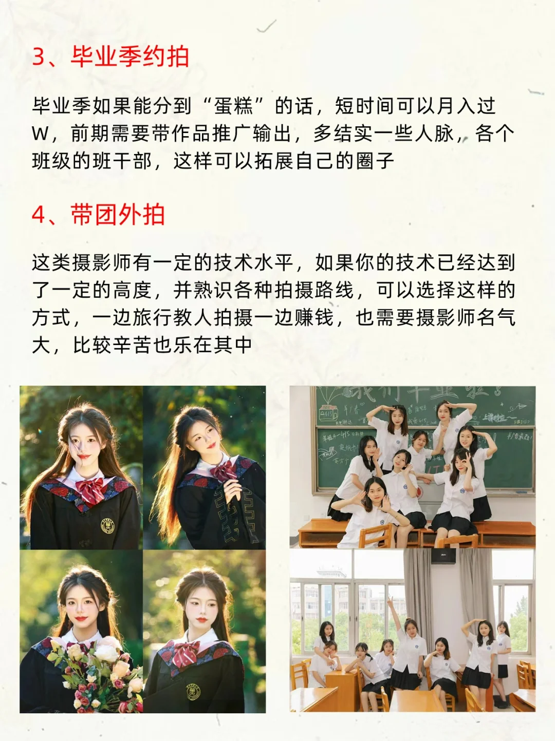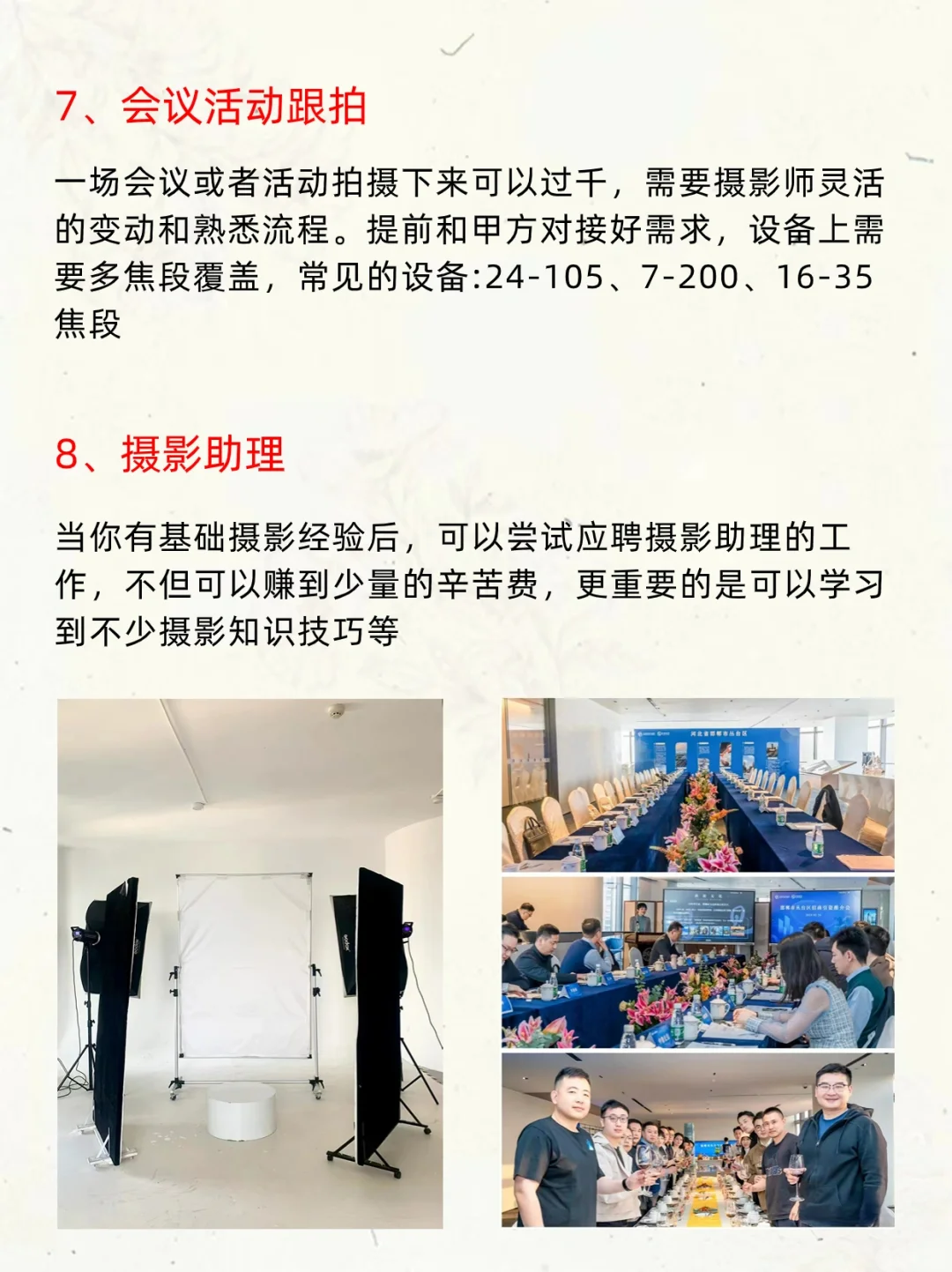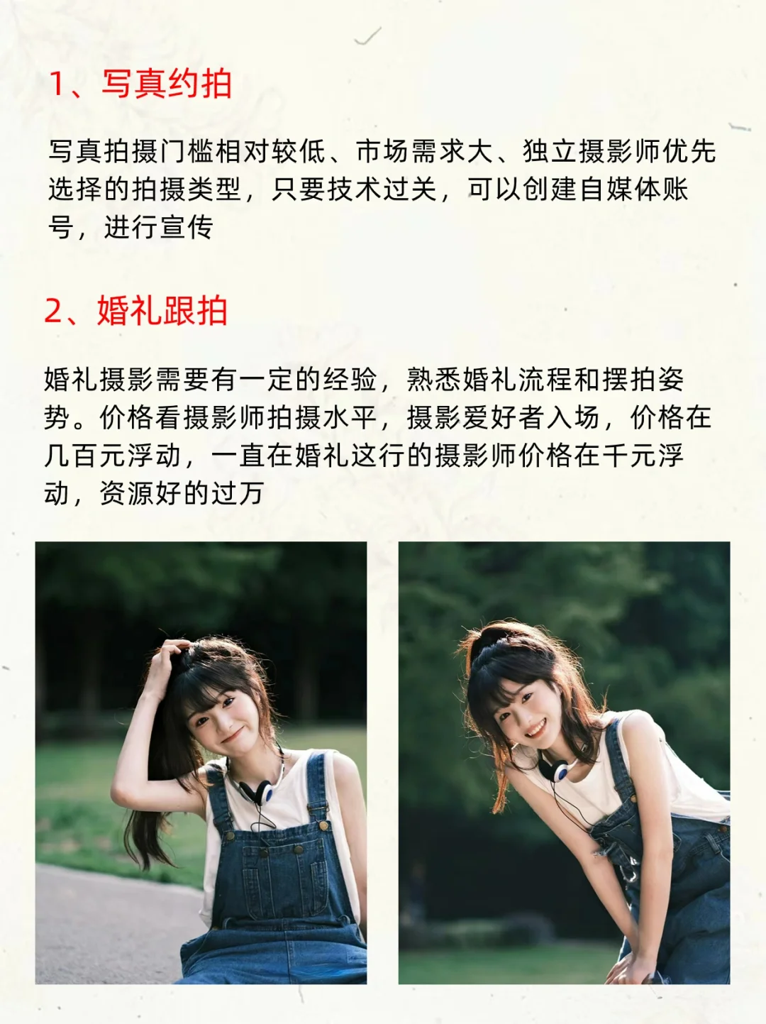 小伙伴们大家好呀,我是摄影师半夏[哇R] - 很多人应该都听过玩摄影穷三代[笑哭R],这话糙理不糙,其实摄影作为副业也很不错,变现的方式有很多,收入也都很可观[赞R] - 半夏今天就整理了12个摄影变现方法,宝子们记得做好笔记哦‼️ - 1⃣️写真约拍 2⃣️婚礼跟拍 3⃣️毕业季跟拍 4⃣️带团外拍 5⃣️领证跟拍 6⃣️活动拍摄 7⃣️会议活动跟拍 8⃣️摄影助理 9⃣️流量变现 -