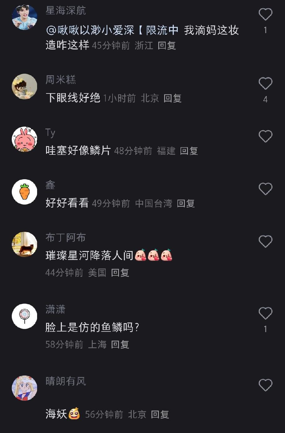 萱妞:我能说,我被周深今天的妆造给吓到了吗?[捂脸] 貌似被吓到的米子不止我一个呦![尬笑] 生米1:这妆造,密集恐惧症肯定受不了![偷笑] 生米2:以为深深长了络腮胡![石化] 生米3:这亮片应该很难洗吧?[泪奔] 生米4:这脸上是长鳞片了吗?[惊呆] 生米5:大鱼?鲛人?人鱼?海妖?[what] 萱妞:[笑哭]不聊妆造了! 七夕节的演唱会,周深通过摩斯密码灯带与生米们表白! 还有这满满爱意的无人机灯光秀!可可与米子在鹊桥相见![飞吻] 祝大家七夕节快乐!!![耶]