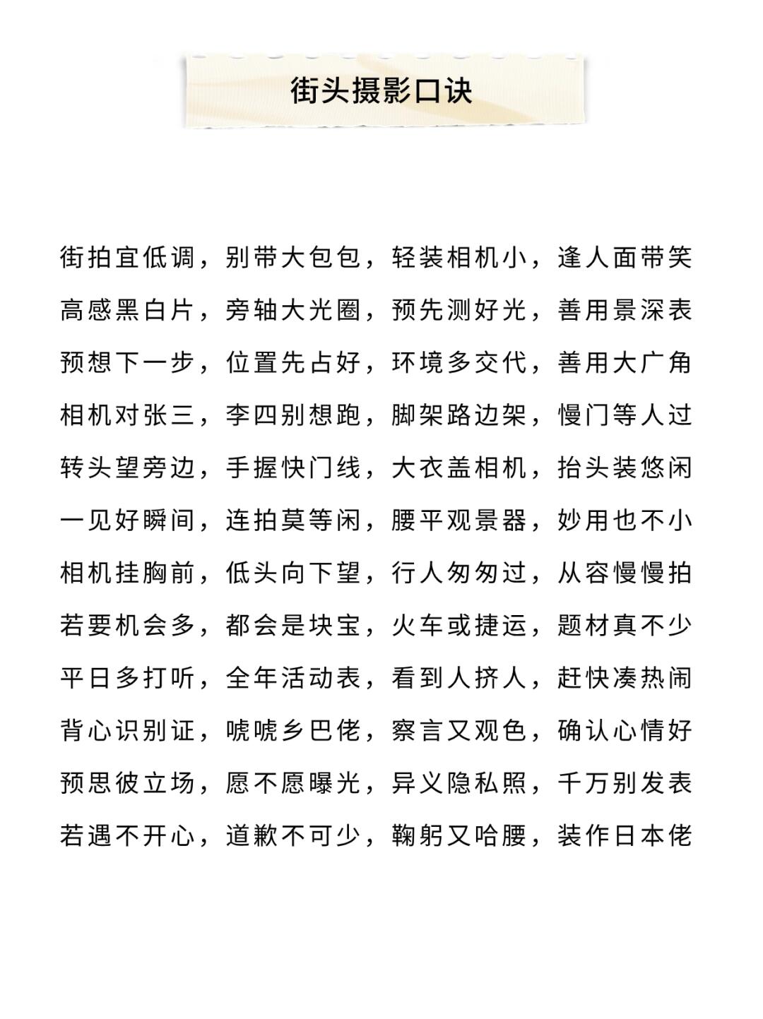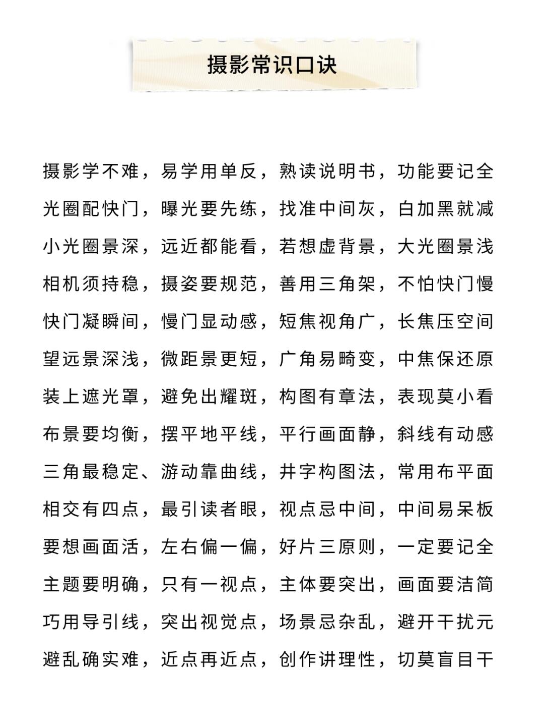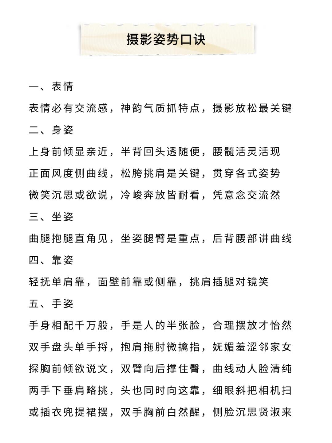 小伙伴们大家好呀,今天给大家分享一份很好用的【摄影口诀】[举手R] - 它包含了许多拍摄中的小技巧,比如人像/风景怎么拍❓姿势什么摆❓光线怎么用❓等等 - 认真看完对你的摄影水平提升会很大‼️ -