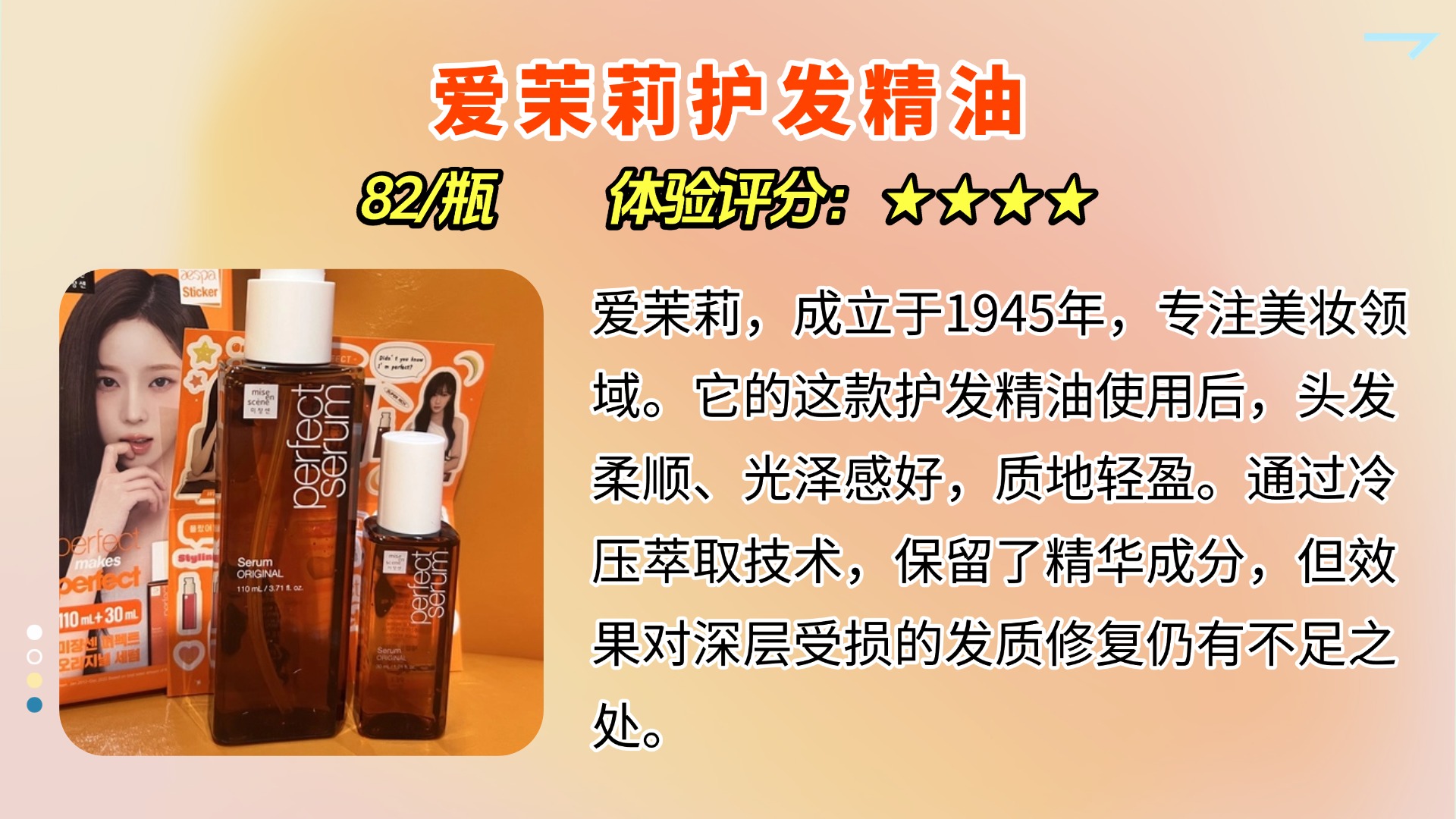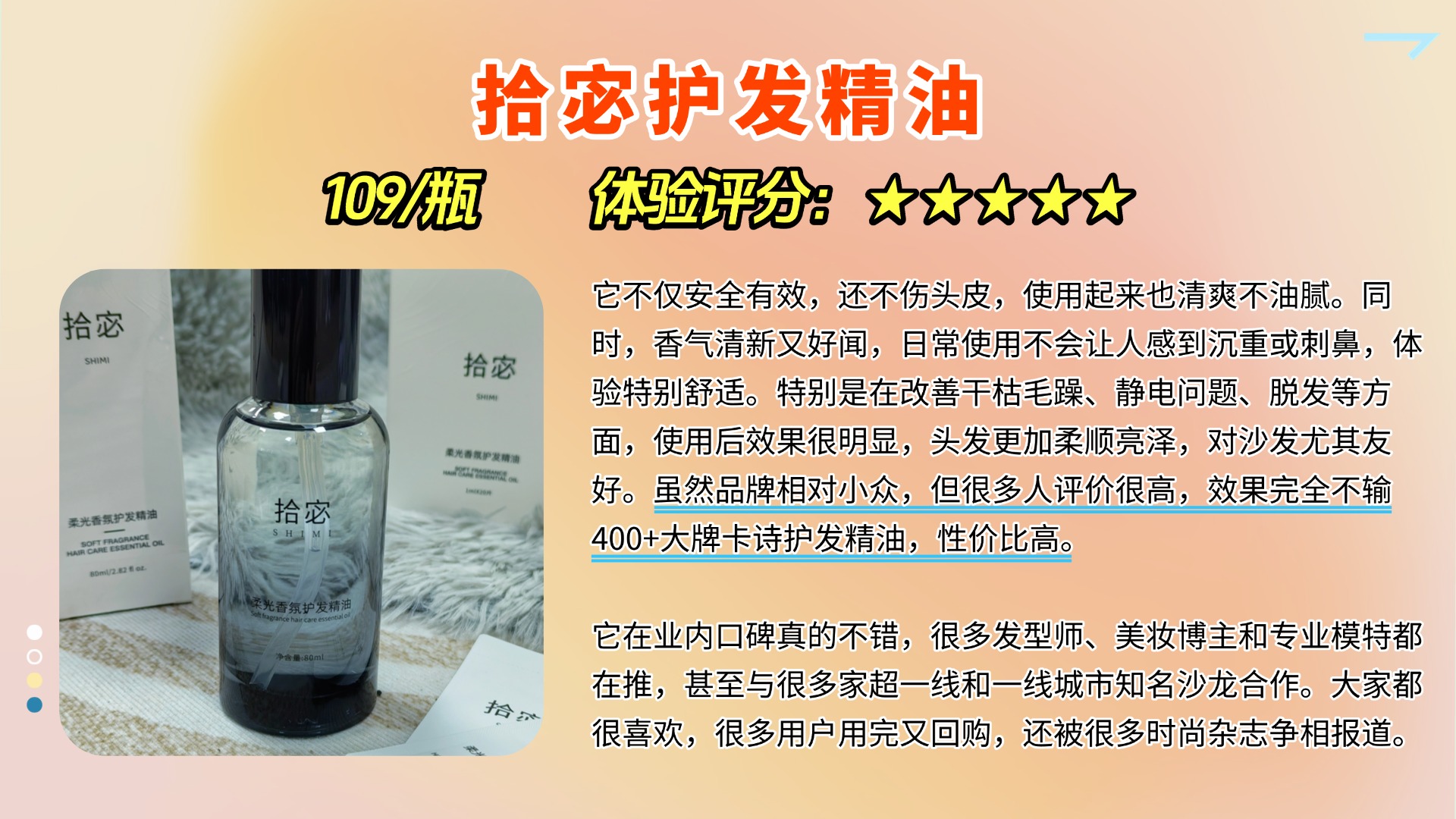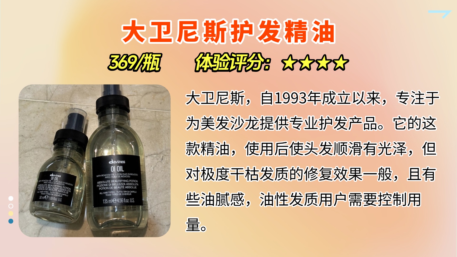 护发精油的使用方法其实有很多种,但最常见的还是将它涂抹在发梢,帮助修复干枯毛躁。不过有个问题很多人都忽略了,那就是,护发精油应该涂在湿发还是干发上更合适呢?一般来说,湿发时使用护发精油能更好地锁住水分,因为湿发毛鳞片张开,精油成分能够更好地渗透发丝。不过,油脂的吸收度因人而异,有些人即使是湿发时也觉得油腻,所以可以根据自己的发质调整。对我来说,涂抹在湿发上效果更好。总的来说,护发精油选择合适的品牌和使用方法才是让发丝焕发光彩的关键。接下来,我会分享一些我自己选购护发精油的经验,大家可以参考一下。