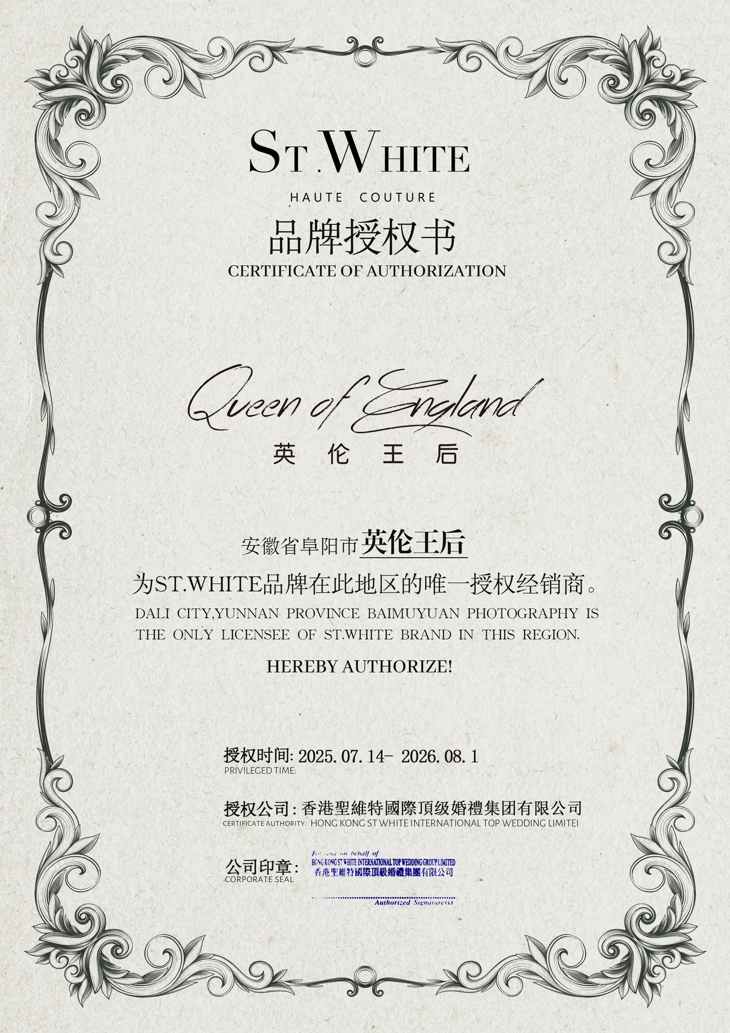 官宣!这家婚纱店太宠新娘啦!!签下❗️❗️ST.WHITE阜阳独家代理授权官宣~ 阜阳地区唯一正品授权店铺❗️🌟🌟备婚的小仙女们有福啦~认准官方正品授权!