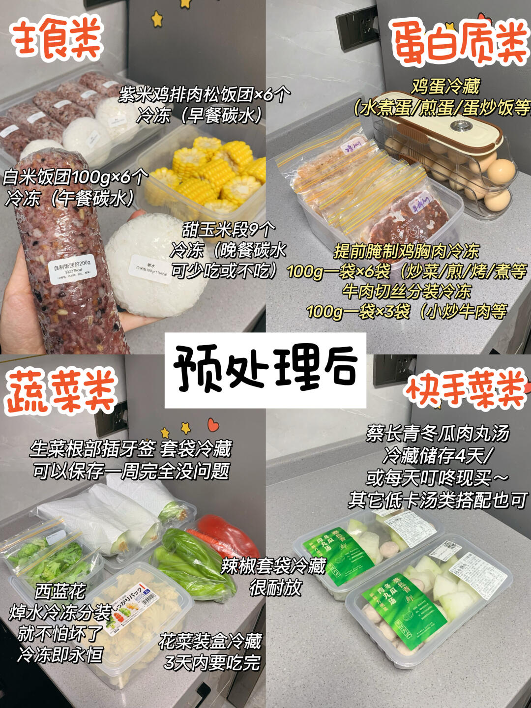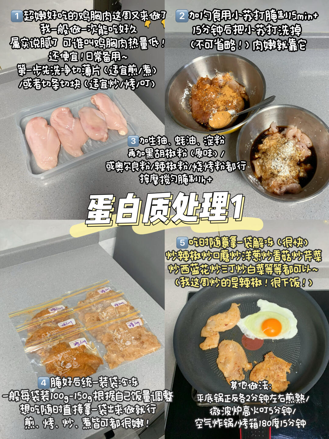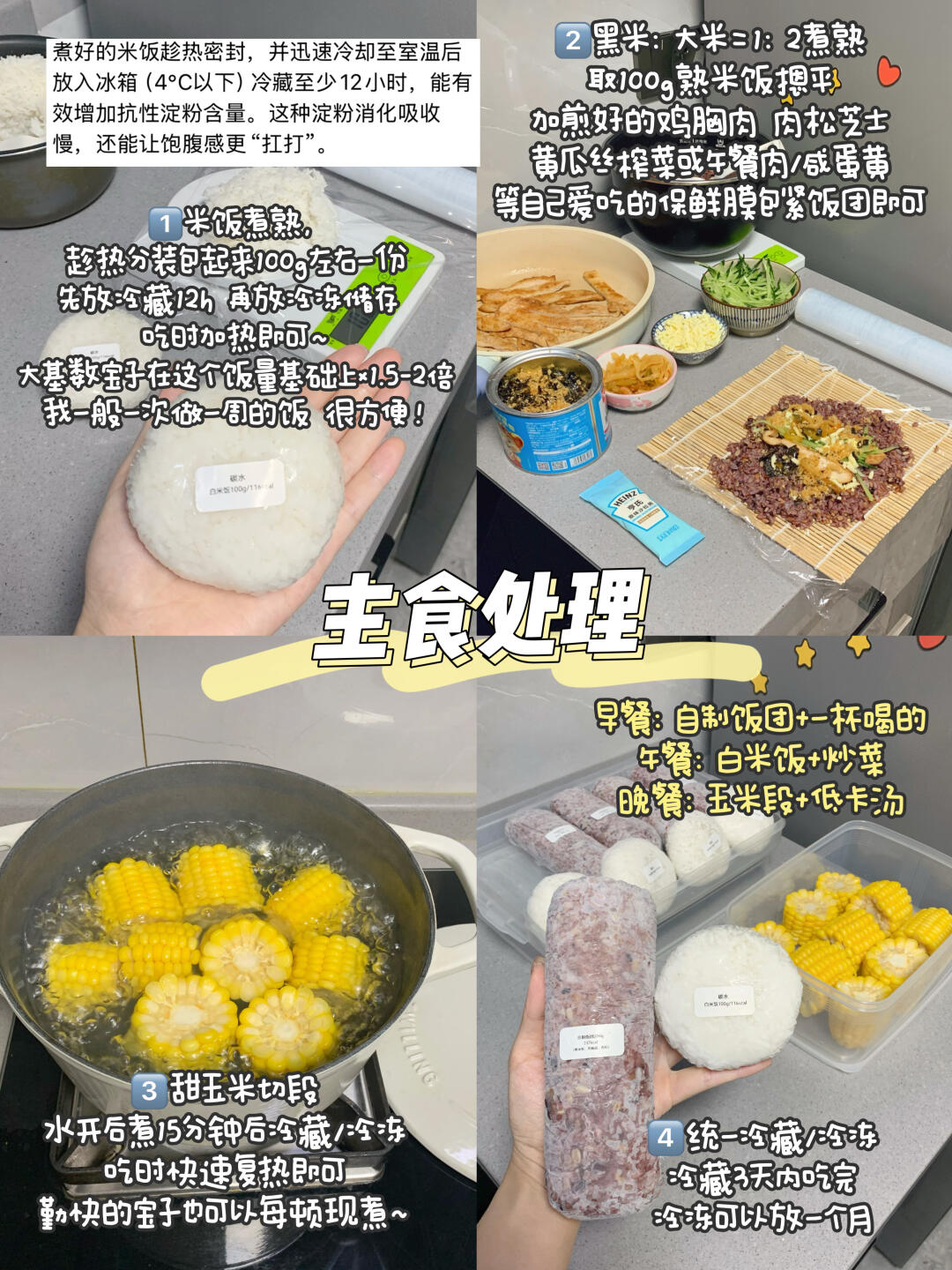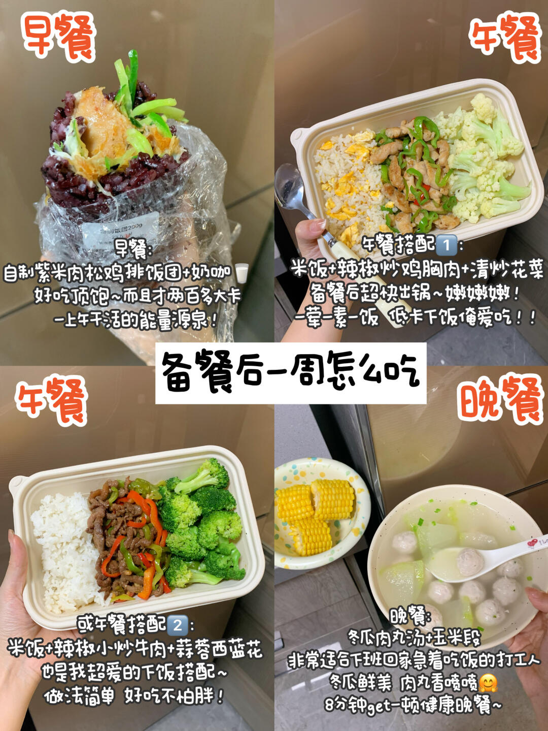💕注:同款食材可以玩花样,怕吃腻的宝可以在这个基础上再加工一下~比如鸡胸肉能煎、烤、煮、炒,搭配各种自己爱吃的蔬菜和菌菇,还可以搭配沙拉/三明治/粗粮/馒头吃等等~冷冻米饭可以配菜吃、炒饭吃,还可以做饭团/饭包/寿司吃等等~