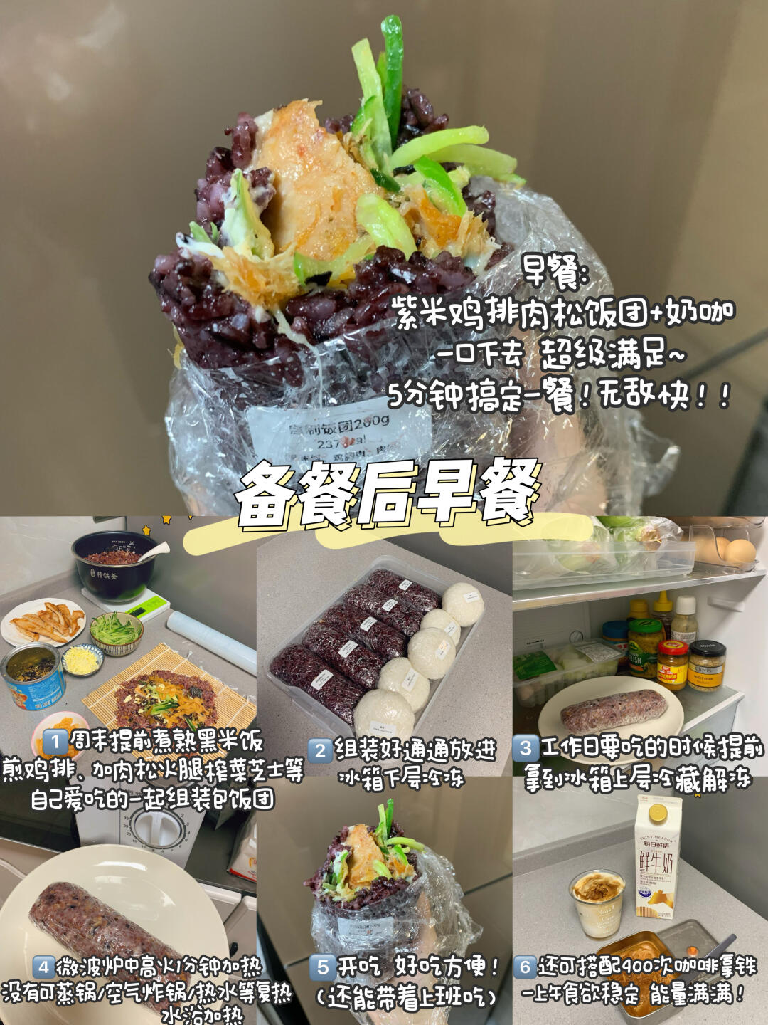 早餐:紫米鸡排肉松饭团🍙+咖啡/牛奶/豆浆等🥛(5分钟)