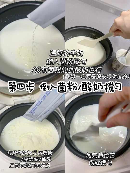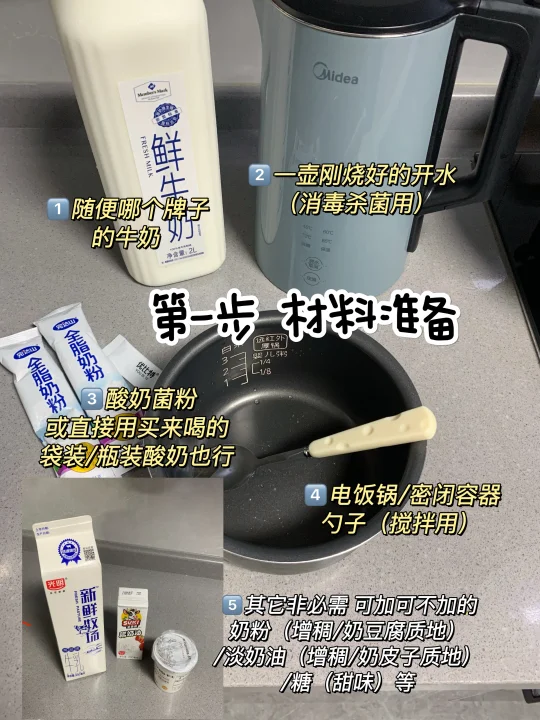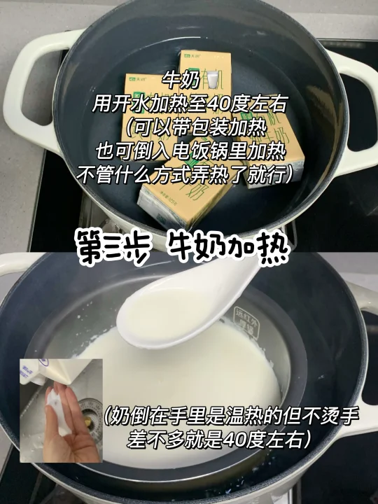 准备奶和菌粉/酸奶、开水容器消毒、牛奶加热到温热、倒入菌粉/酸奶、盖上盖子等待发酵8-10小时即可成功~