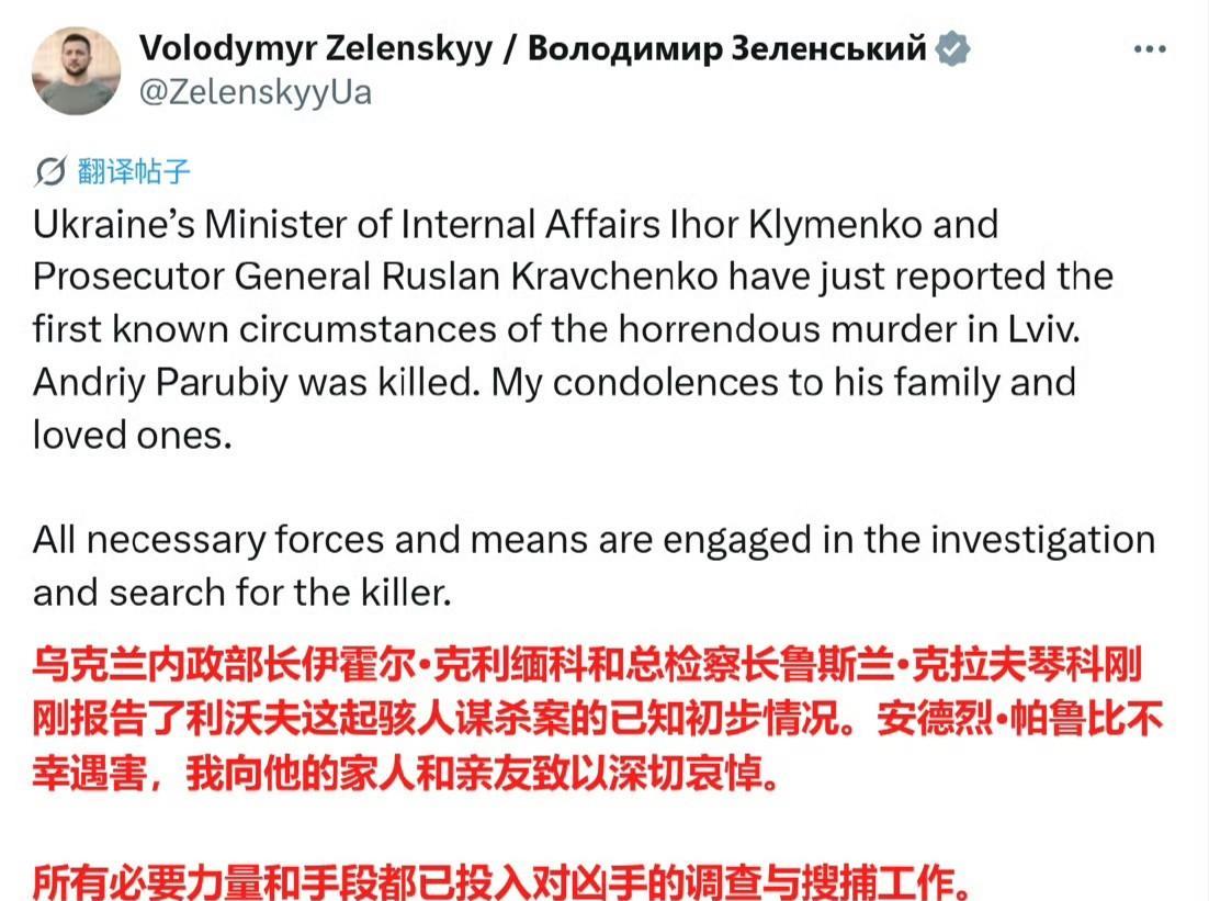 突发:乌克兰前高级政要,泽连斯基批评者帕鲁比在乌克兰城市利沃夫遭遇暗杀! 消息来源:乌克兰媒体 8月30日据乌克兰媒体报道, 乌克兰前高级政要帕鲁比被暗杀身亡! 随后泽连斯基在其个人社交平台上证实了此消息,并放话将全力抓捕刺客! 据乌克兰媒体透露帕鲁比是在利沃夫街头,被一名伪装成快递员的刺客暗杀,根据现场照片显示帕鲁比头部遭遇了致命伤! 以下为帕鲁比的个人简介 帕鲁比:亲西方乌克兰政要,2014年任乌克兰议会议长兼国家安全与国防委员会主席,在2014年乌克兰“广场颜色革命”中是一名现场指挥员,16年担任乌克兰最高拉达主席,在2019年波罗申科与泽连斯基竞选期间表现活跃,泽连斯基当选乌克兰总统后,他成为了一名反对者,是泽连斯基政府主要的批评者之一。