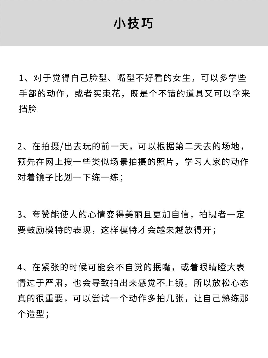 小伙伴们大家好呀,我是摄影师半夏[萌萌哒R] - 最近经常听到有小伙伴说拍照不上镜、拍照丑,半夏今天针对拍照中容易出现的一些问题,总结出了几个小技巧: 1⃣️注重拍侧脸 2⃣️分散注意力 3⃣️突出氛围感 4⃣️拍远景、抓拍 - 具体内容都放在图片里啦,宝子们快去看看叭[赞R] -
